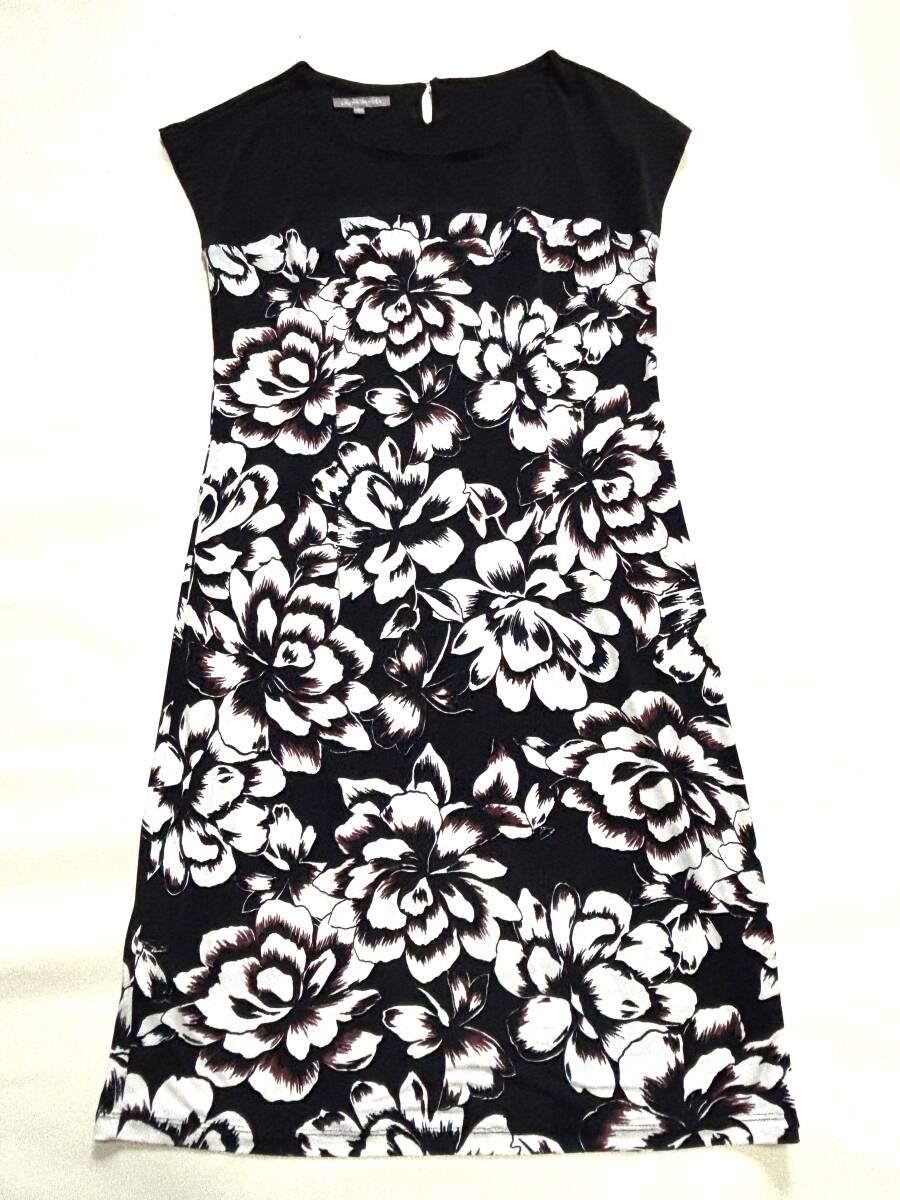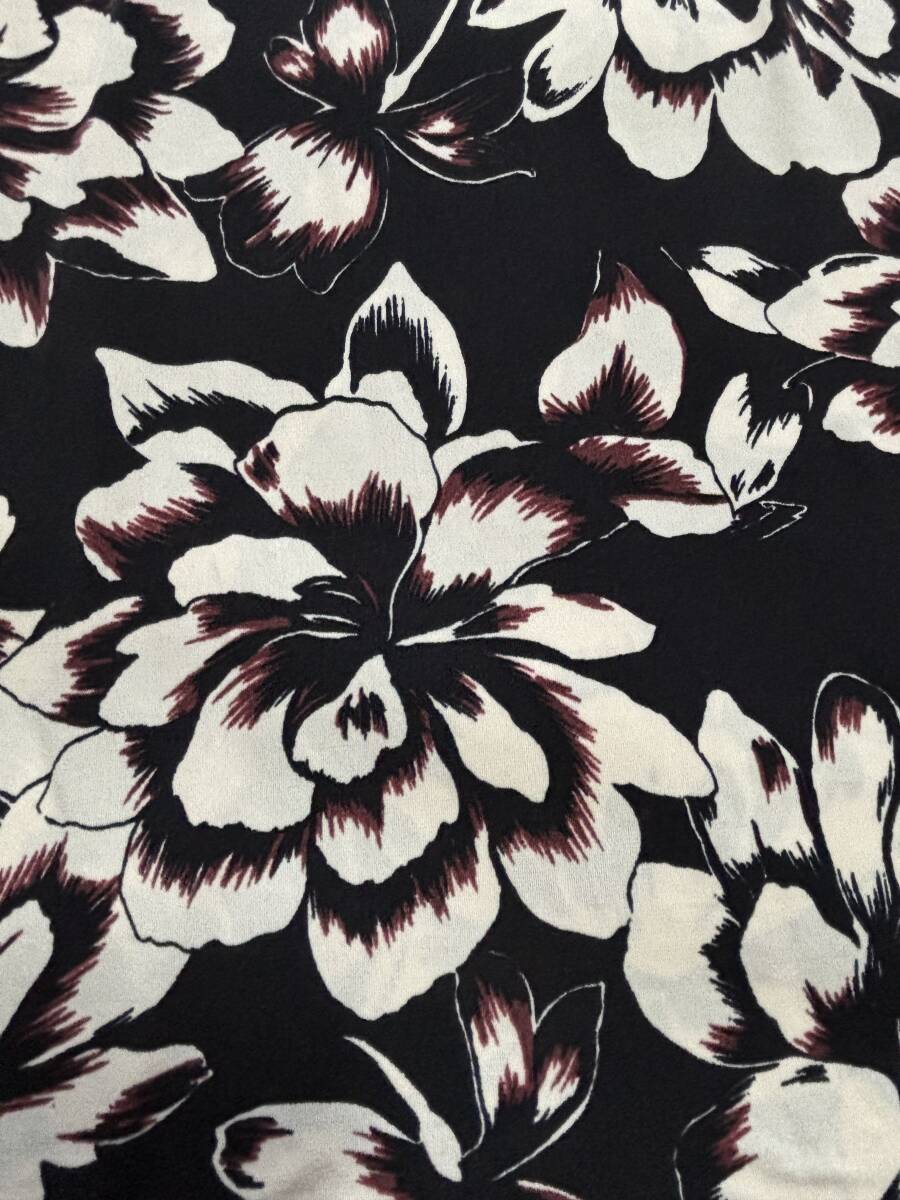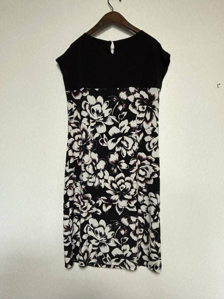 ■ 特徴:ストレッチ素材で動きやすいワンピース。色は黒地に白やブラウンの花柄。家庭でお洗濯が可能です