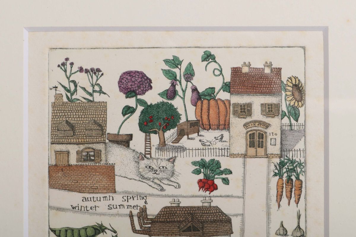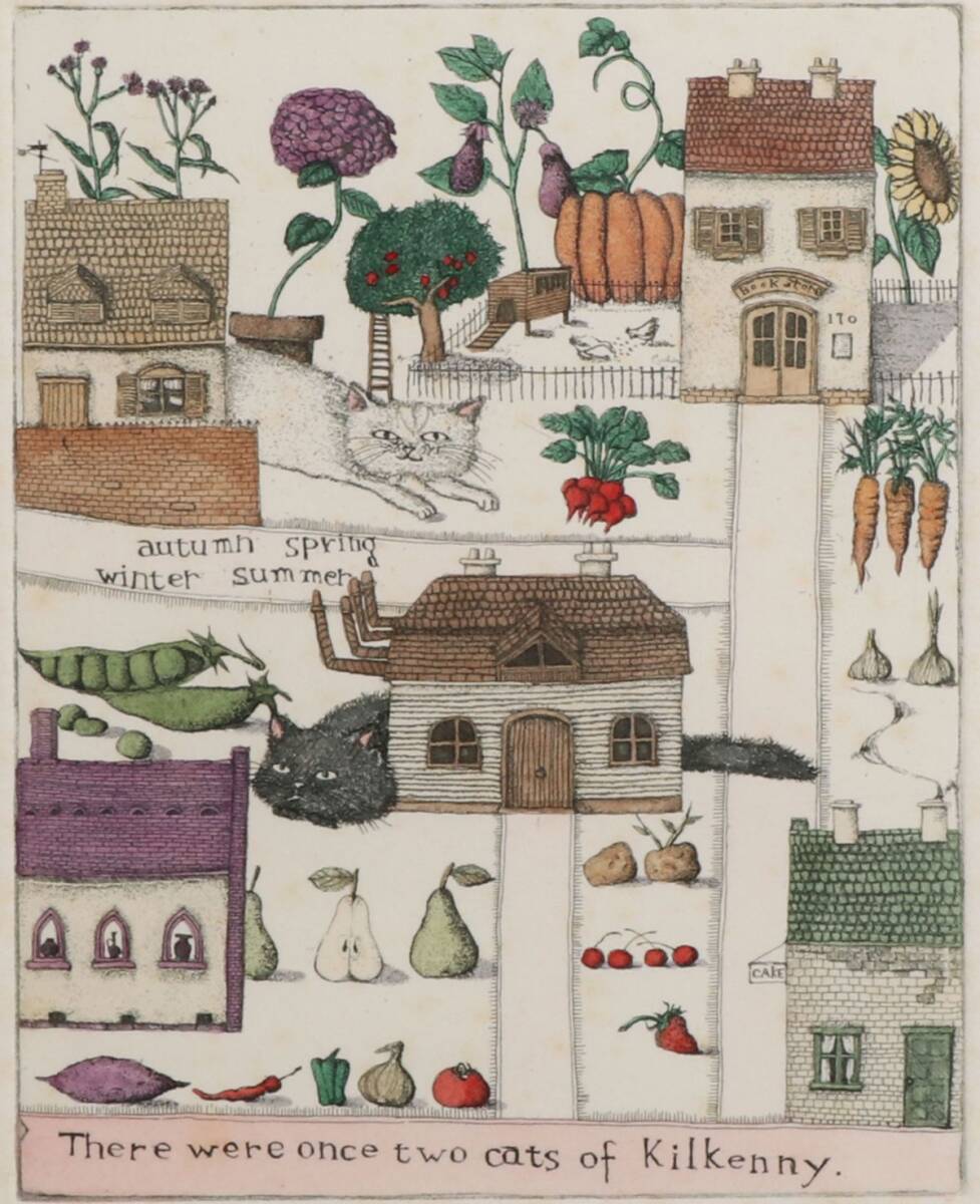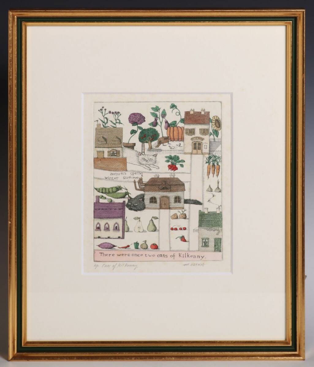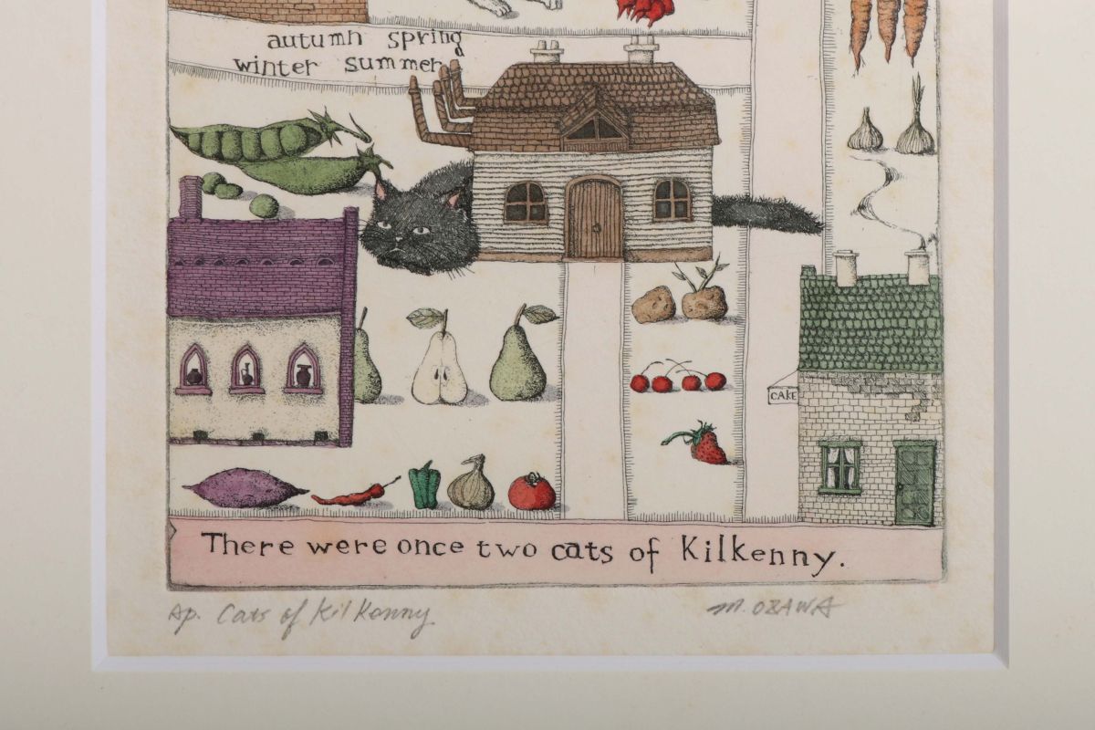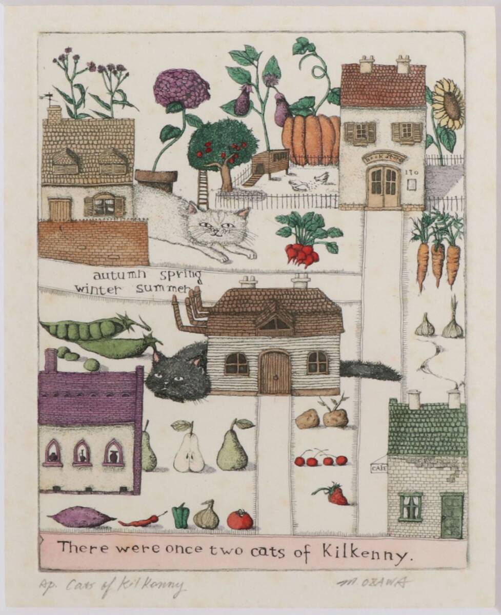 9368 小澤摩純 「Cats of kilkenny」 銅版画+手彩色 額装 真作 検:女子美 挿絵 絵本 イラストレーター