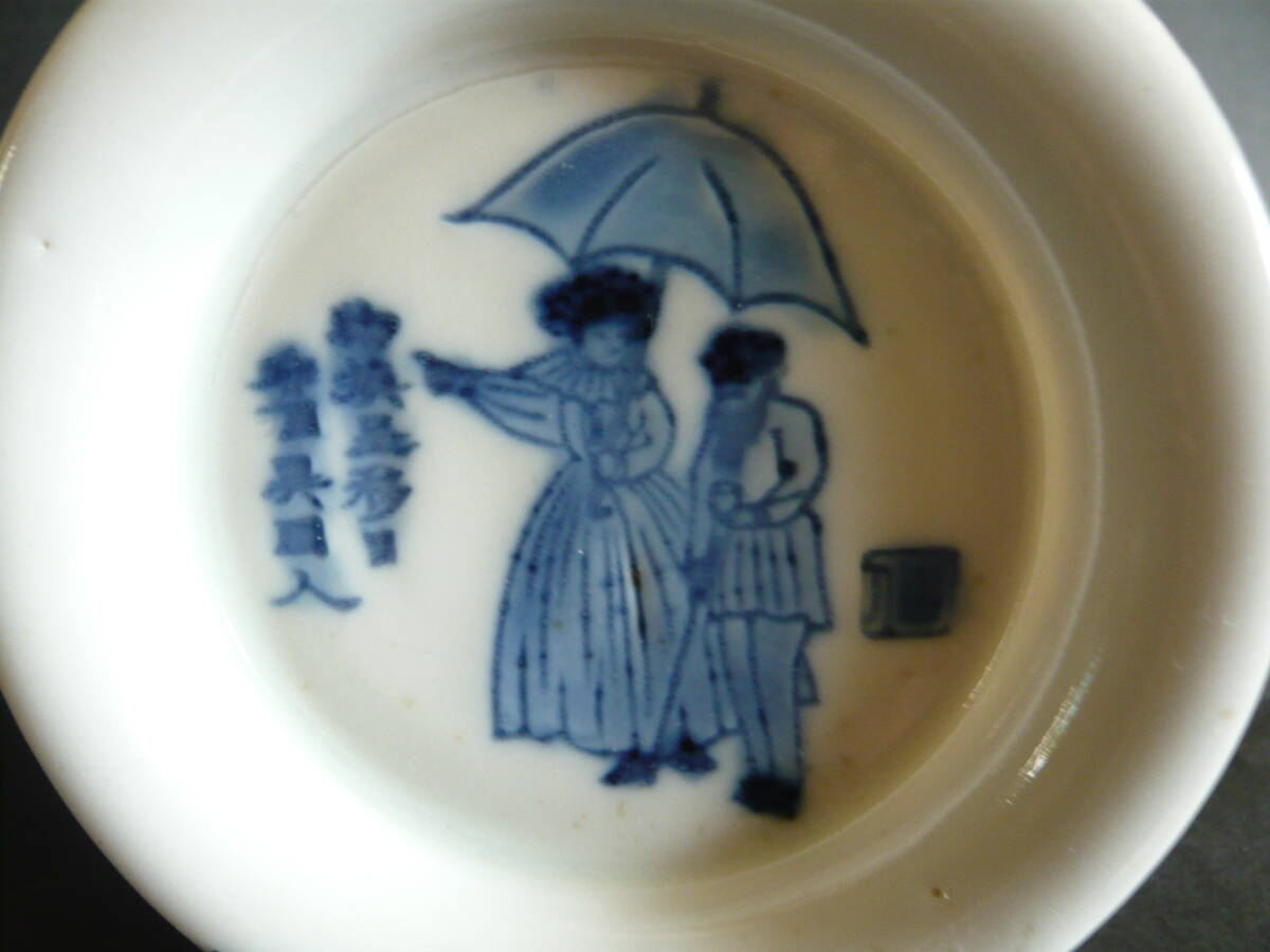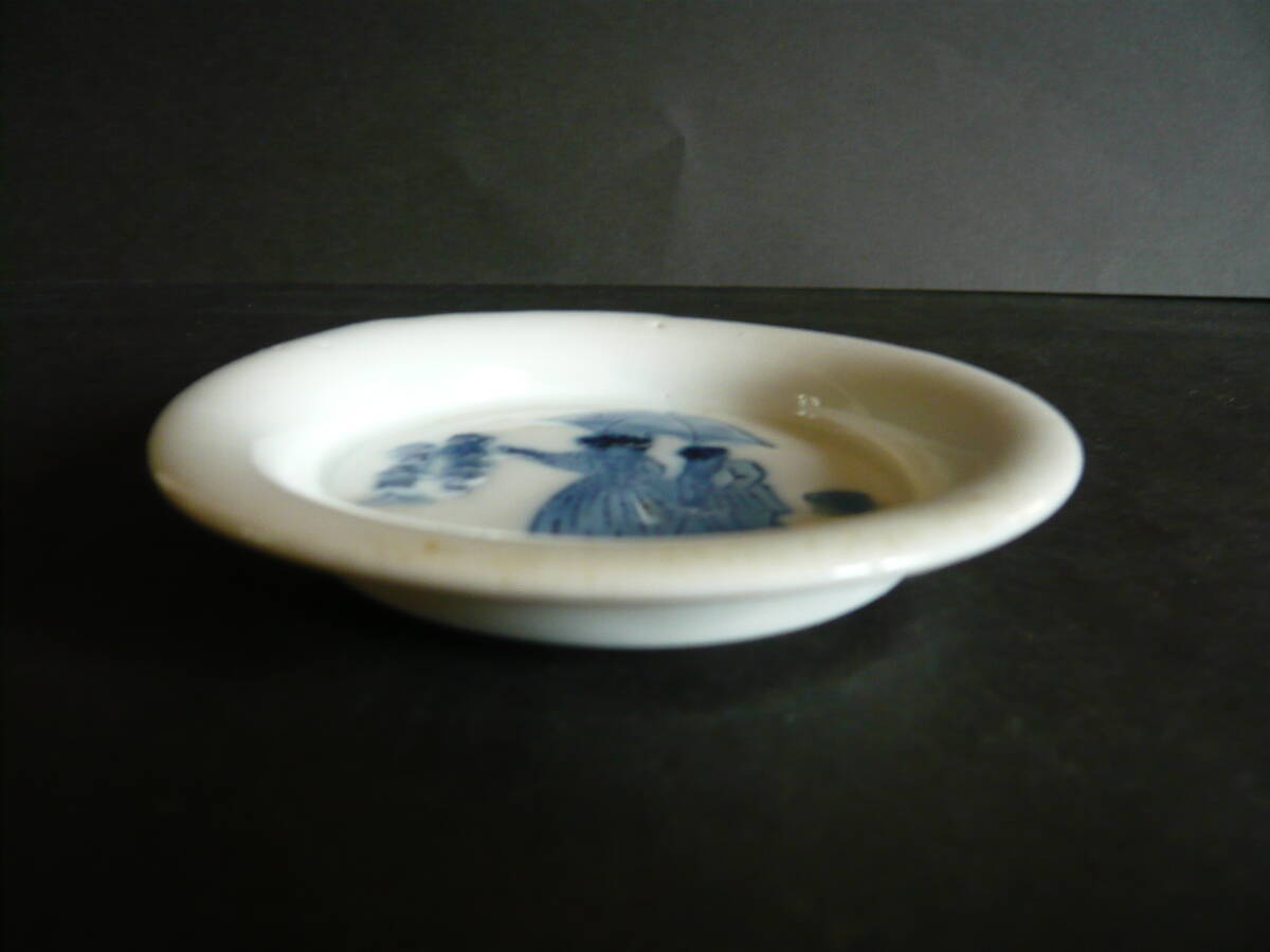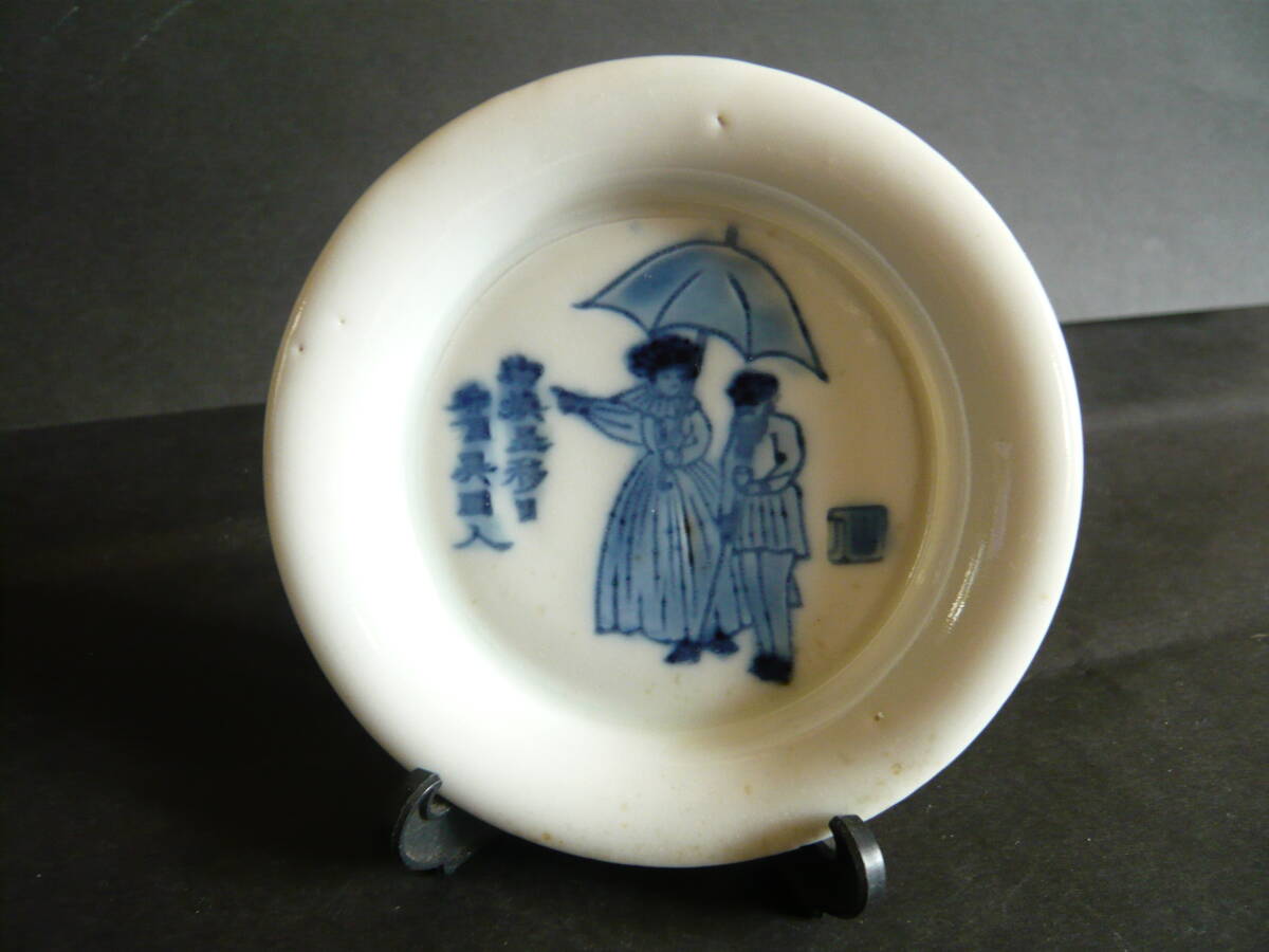 図変わり、文明開化パラソル図の小皿です。径約9.5センチ、高さ約1.7センチ、高台径約5.5センチ、傷はありません。