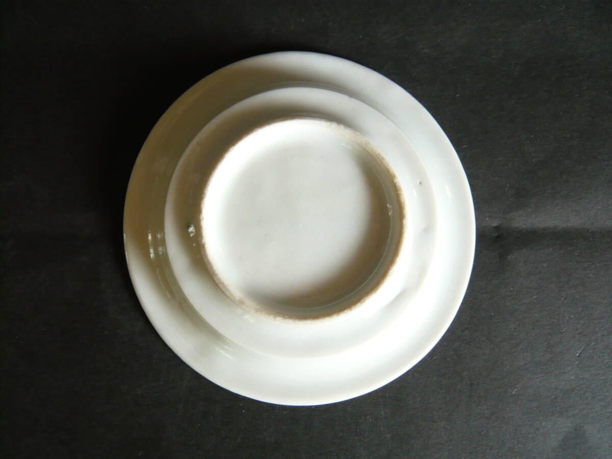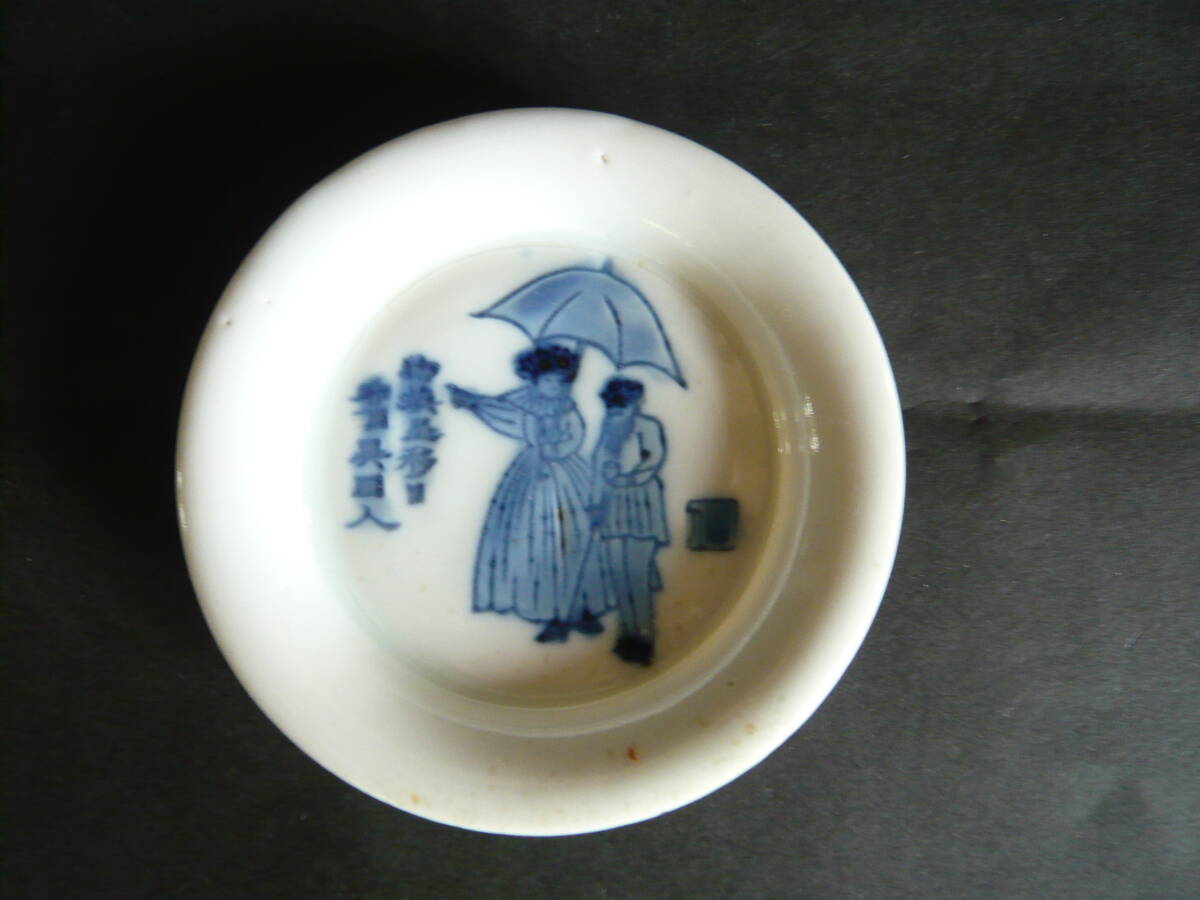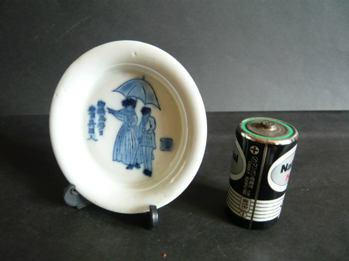 図変わり、文明開化パラソル図の小皿です。径約9.5センチ、高さ約1.7センチ、高台径約5.5センチ、傷はありません。