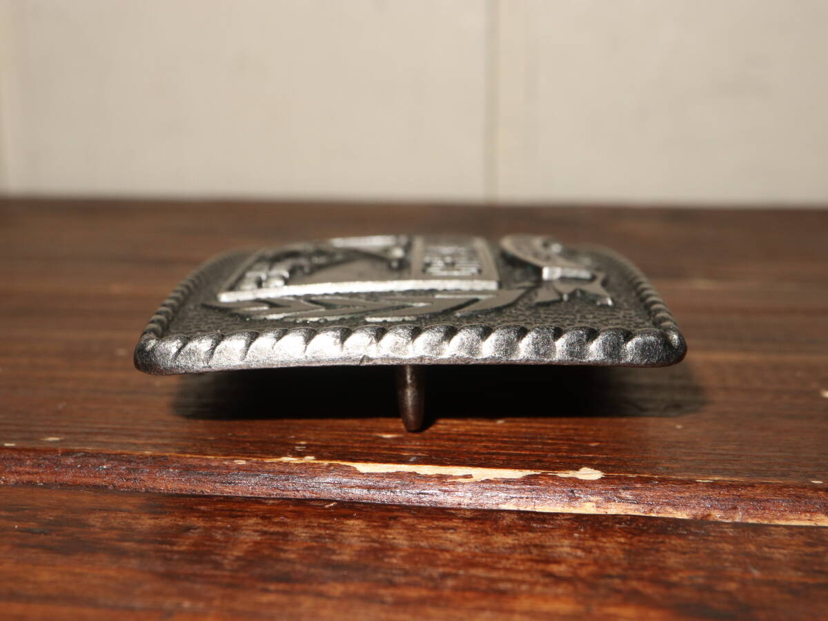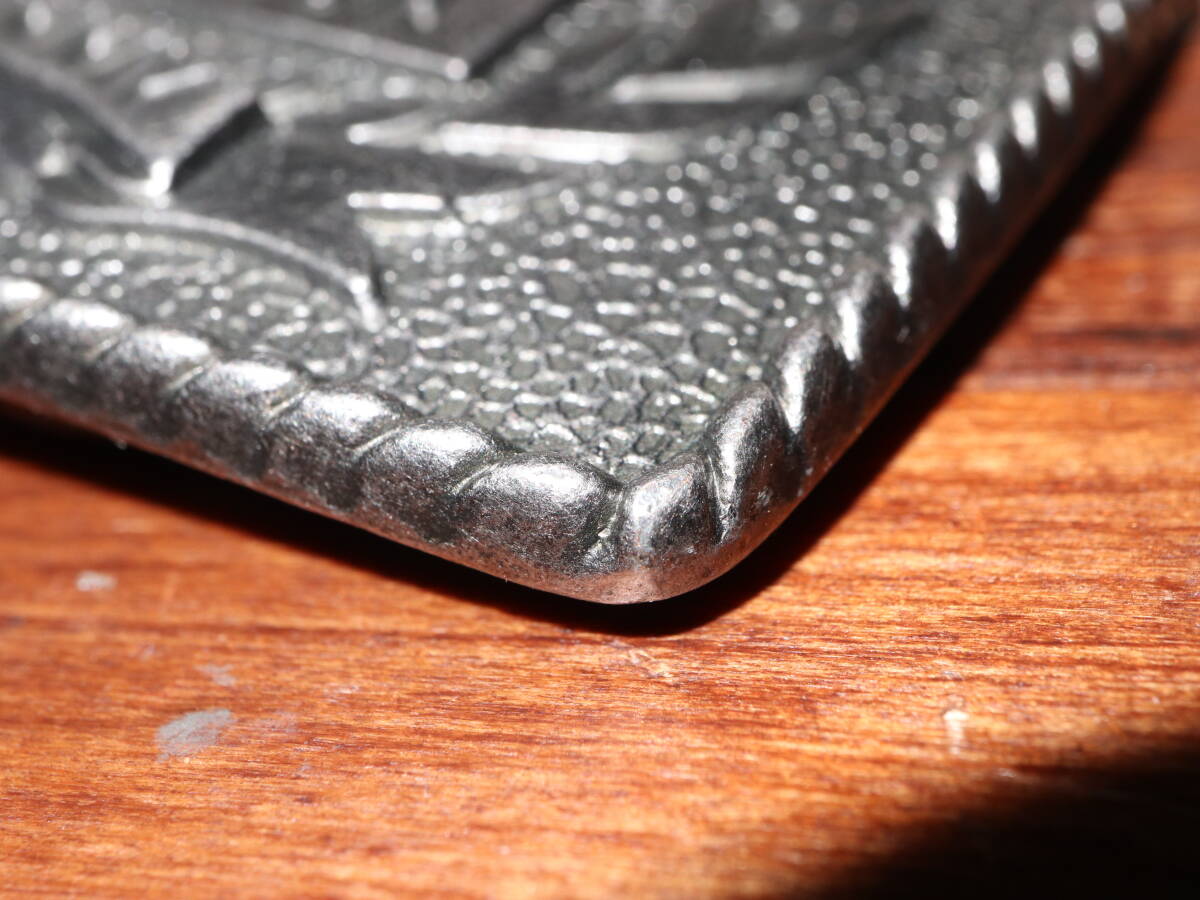 素材は不明ですが、ブラスかピューターにアンティーク加工のシルバーメッキが施されているものと思われます。