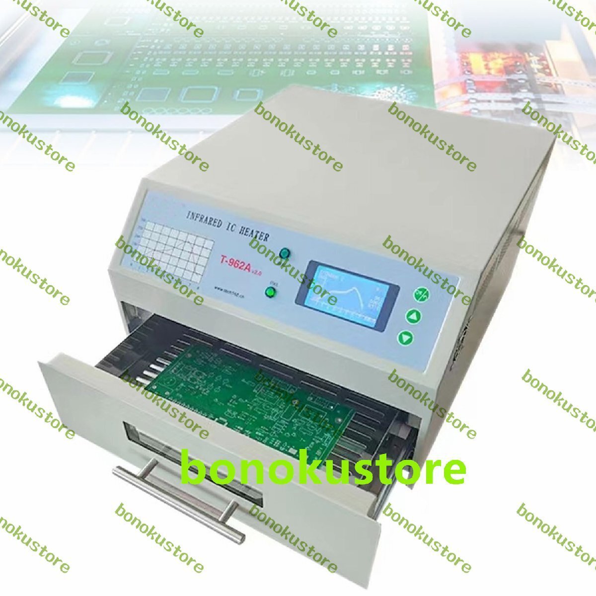 名前: リフローはんだ付け機 電圧: 110V/220V 電力: 150W 温度制御: 0-280℃ 引き出しエリア: 300x200mm プロセスサイクル: 1-8分 制御方法: 8つのインテリジェントな温度曲線制御 パック: 1x リフローはんだ付け機