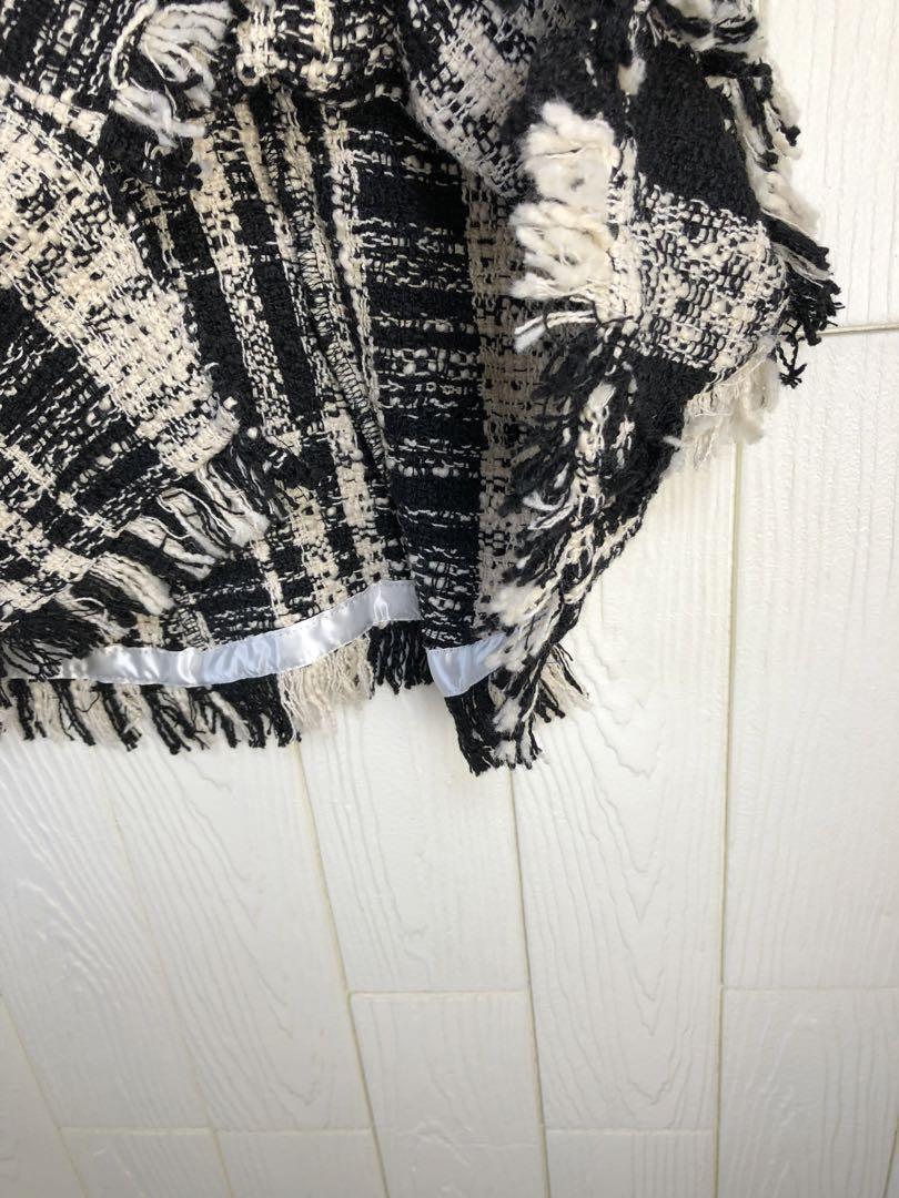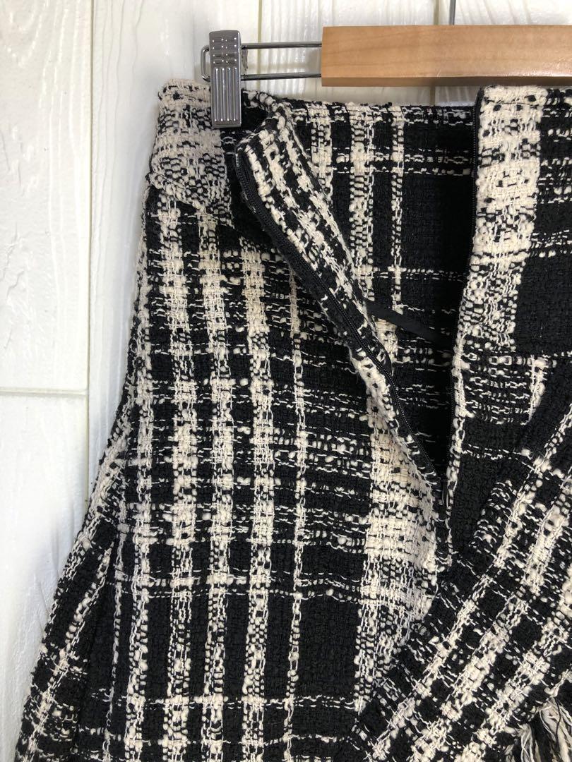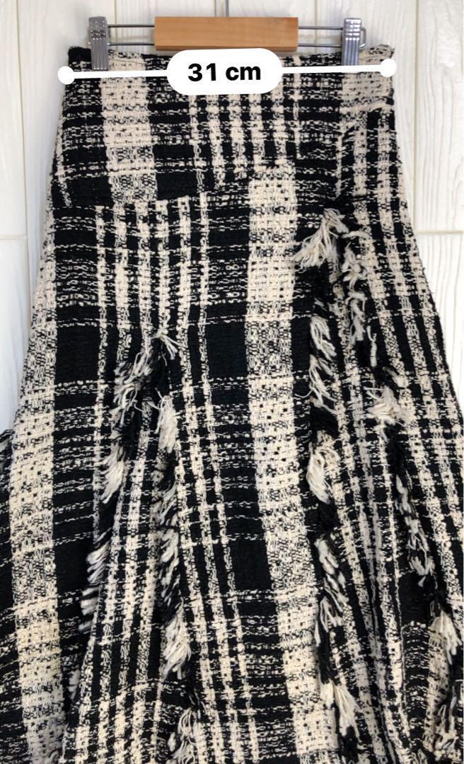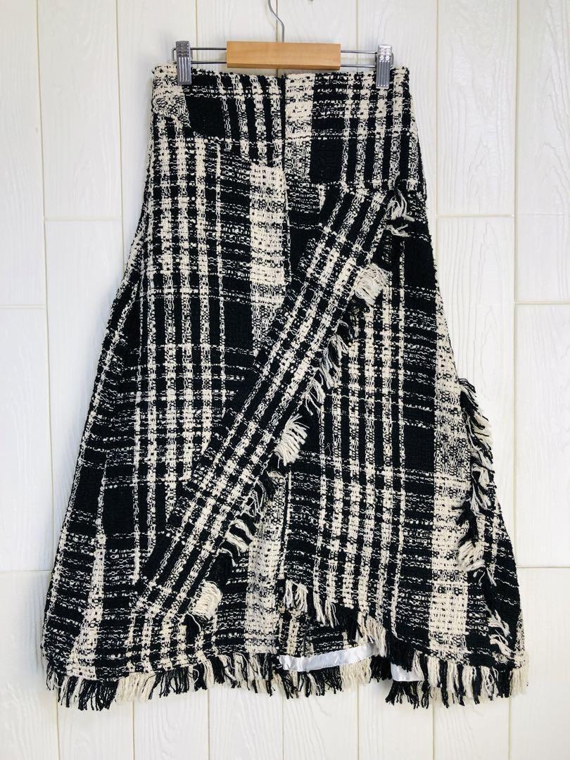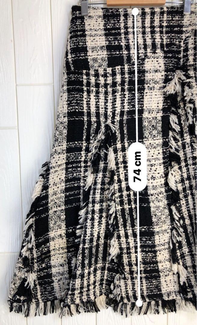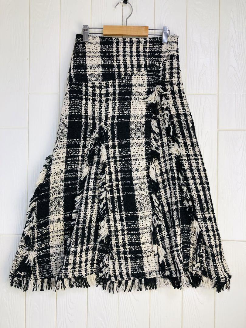 ブラックとホワイトのチェック柄で、フリンジが特徴的なロングスカート。