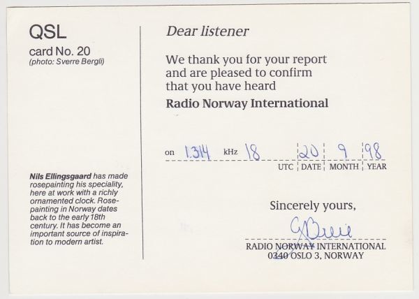 | 商品説明 | Radio Norway International のベリカードです。カード取得者の名前は記載ありません。 |