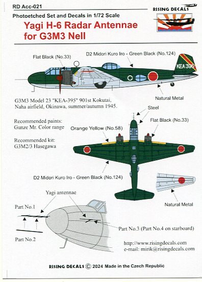 | 三菱九六式陸上攻撃機23型(G3M3)用のH-6レーダーアンテナ(空6号無線機)と那覇飛行場第901航空隊のマーキングデカールです。真鍮エッチング製。1/72スケール用。新品です。Acc-021 | ||