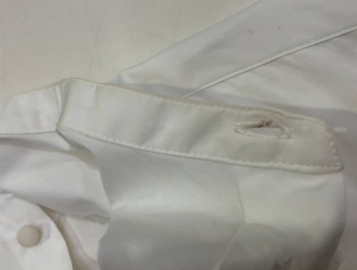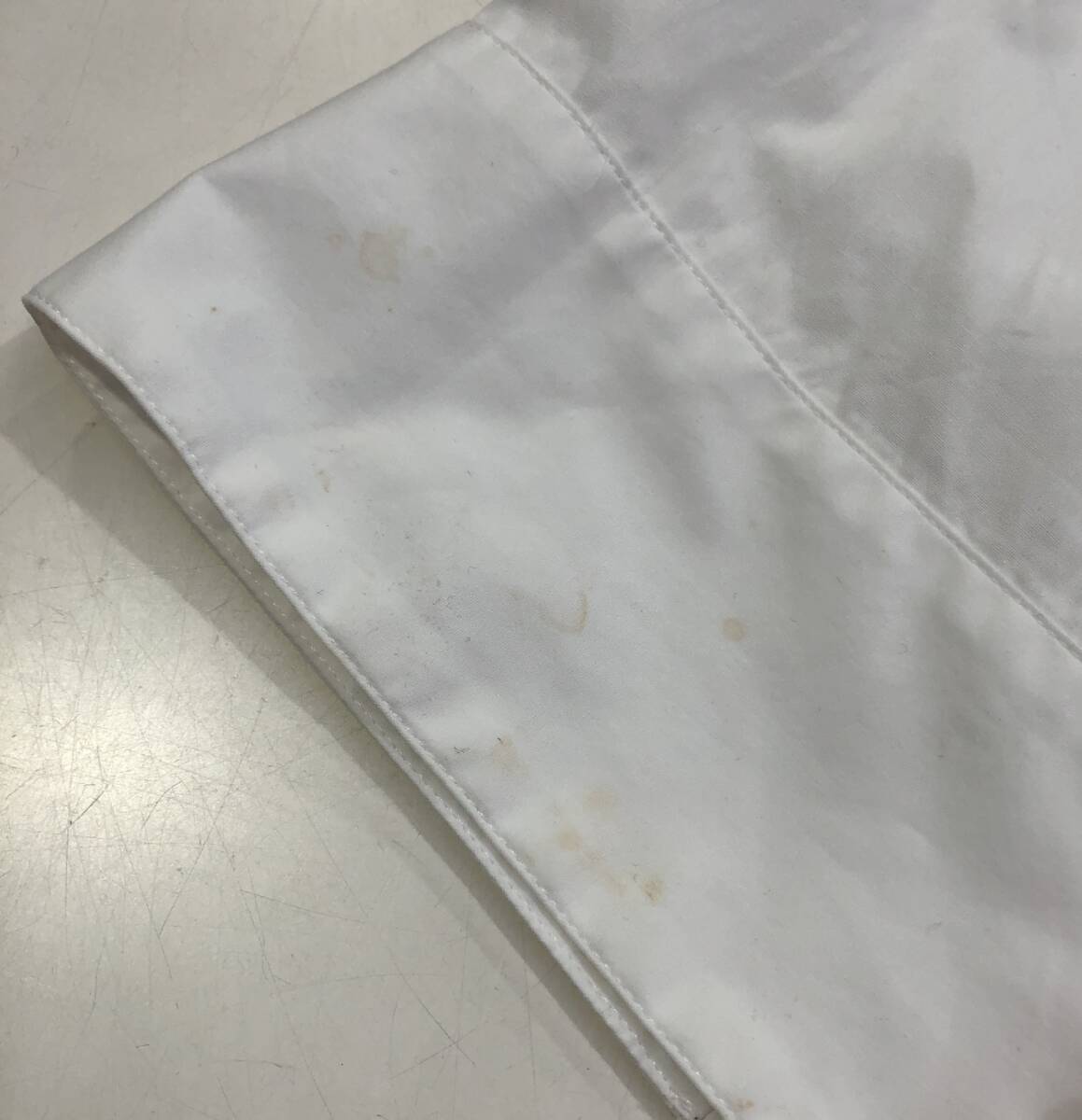 状態:写真ではわかりませんが首回り全体に黄ばみがあり(写真6枚目)、左袖口に汚れ(7枚目)、背面・ポケット・肩に小さな薄い汚れがあります(6.8枚目)。