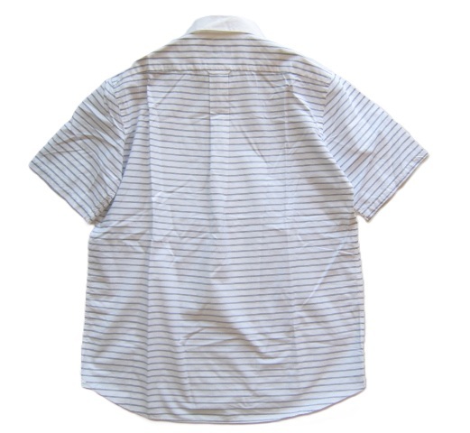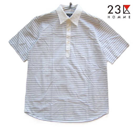 美品日本製!!23区オム 23区HOMME*胸ポケット付き ボーダー柄半袖プルオーバーシャツ 50 実寸L 白×ダークグレー トラッド アイビー