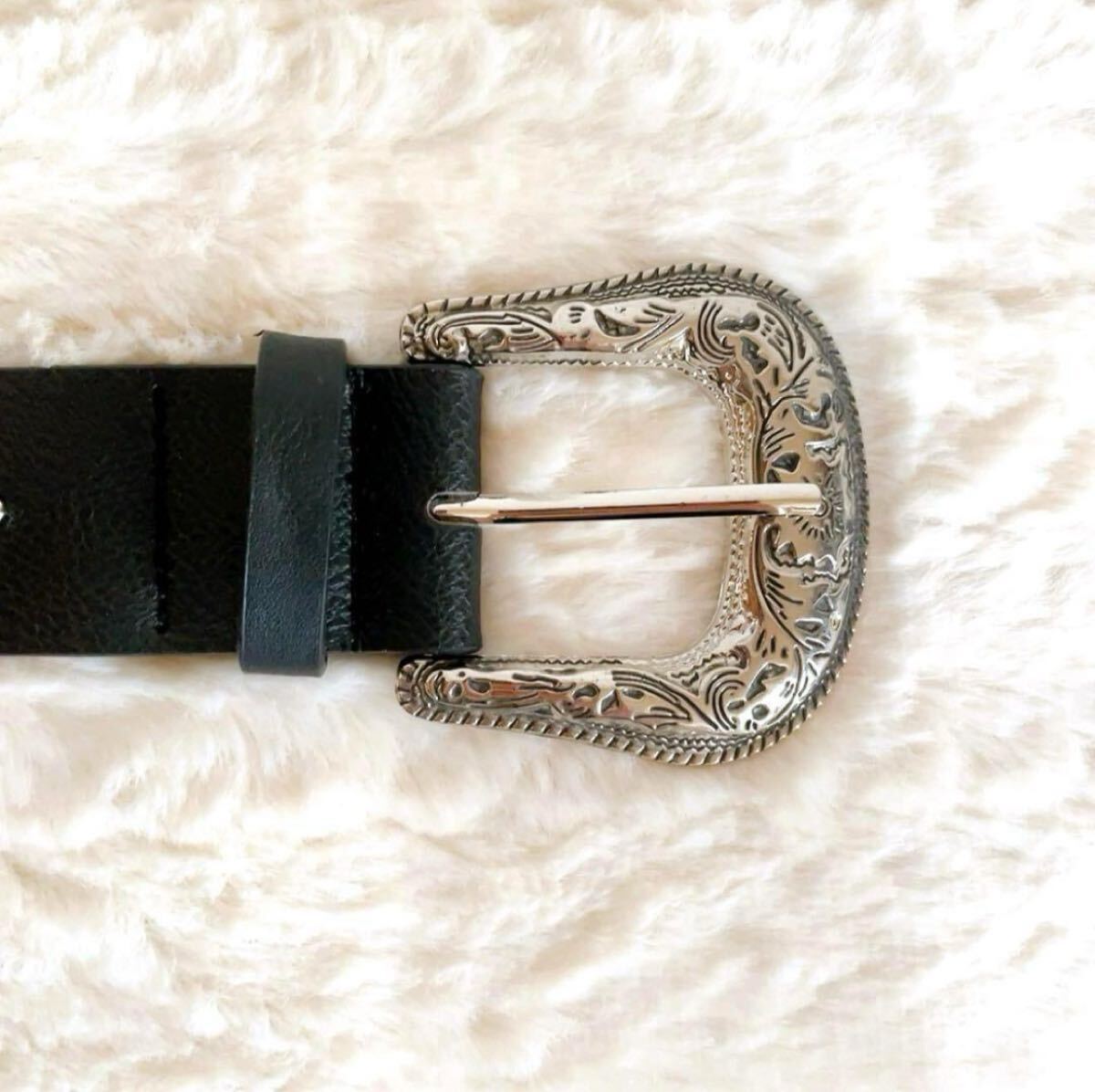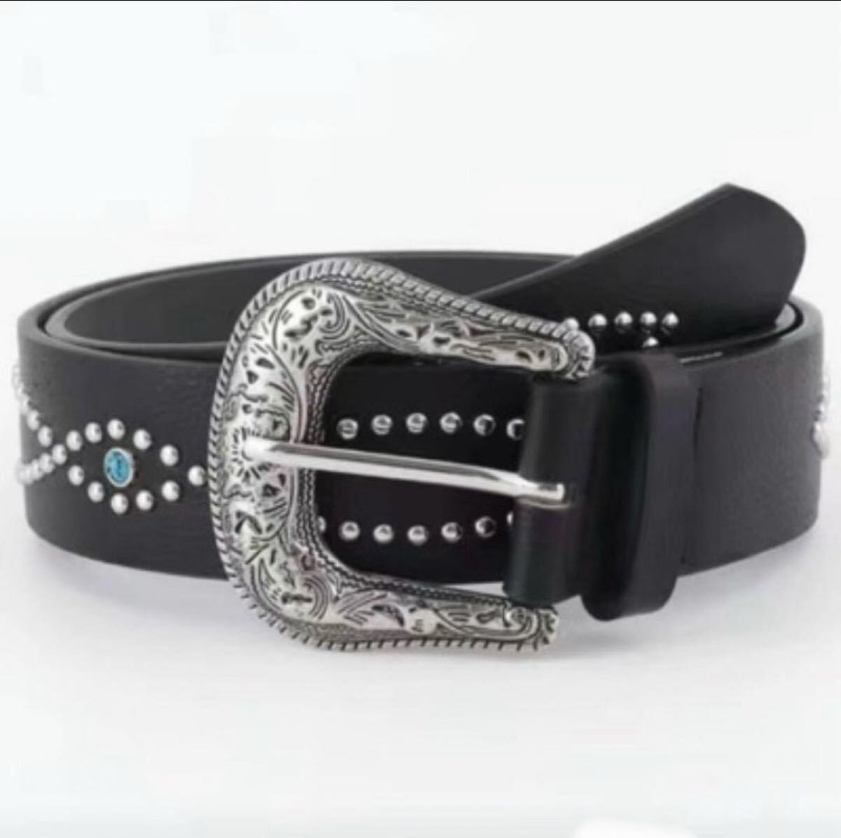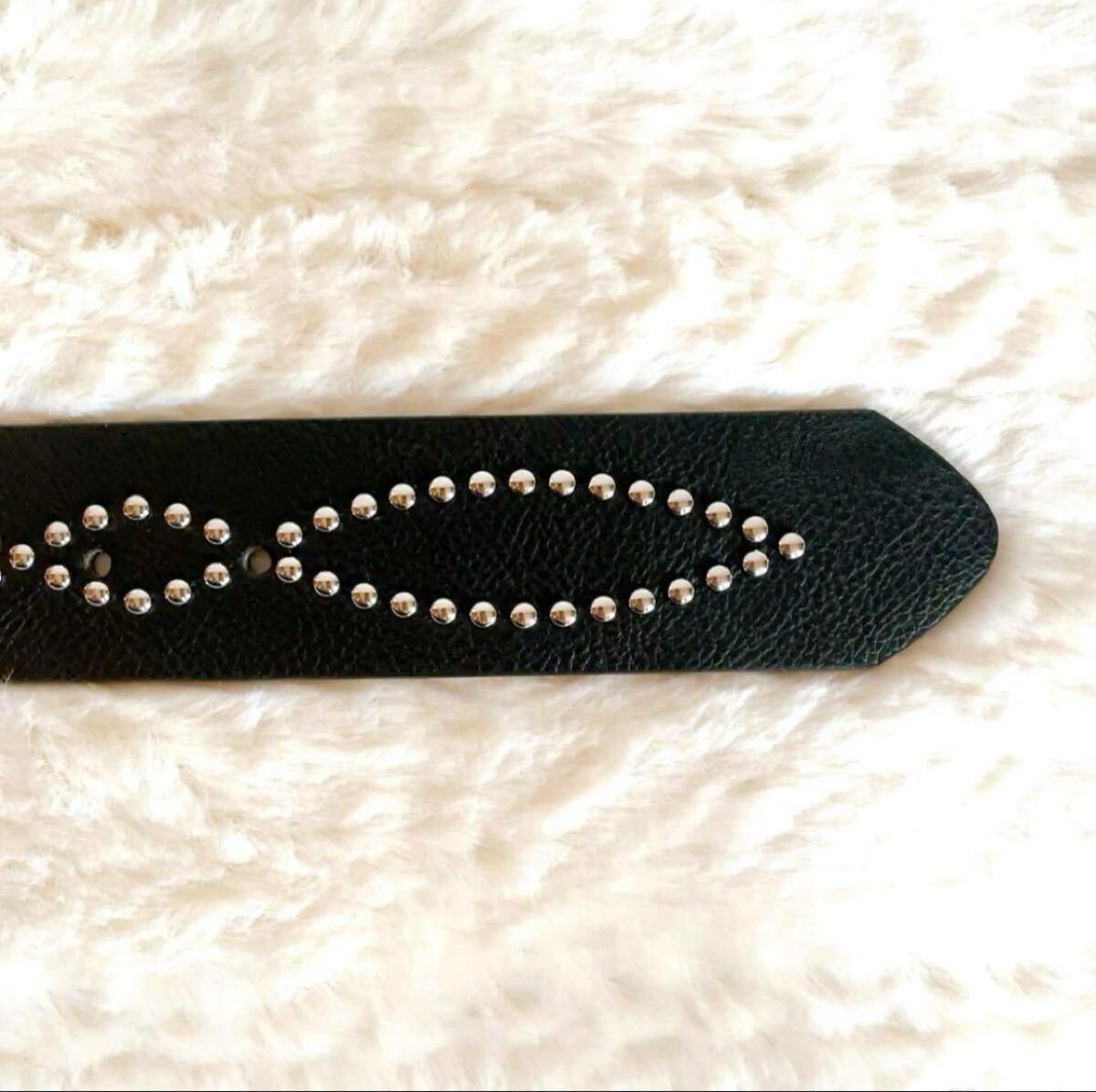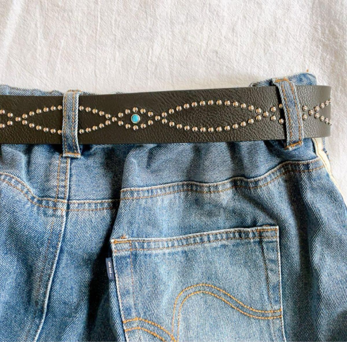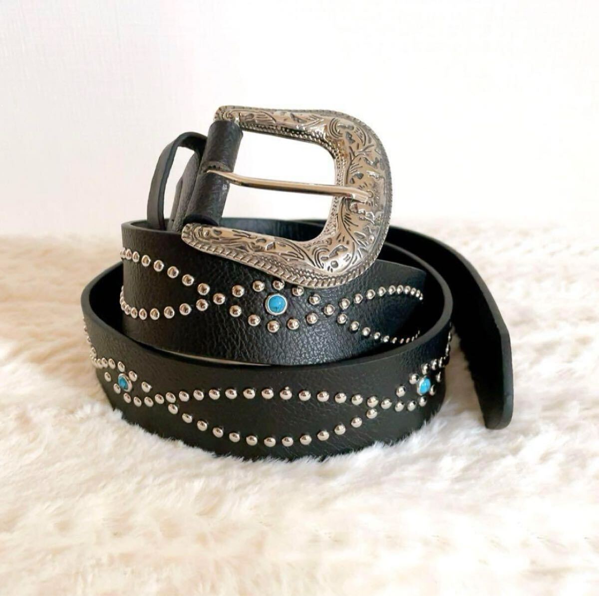 スタッズとターコイズ色の石が施された黒いレザーベルト。(フェイクレザー)