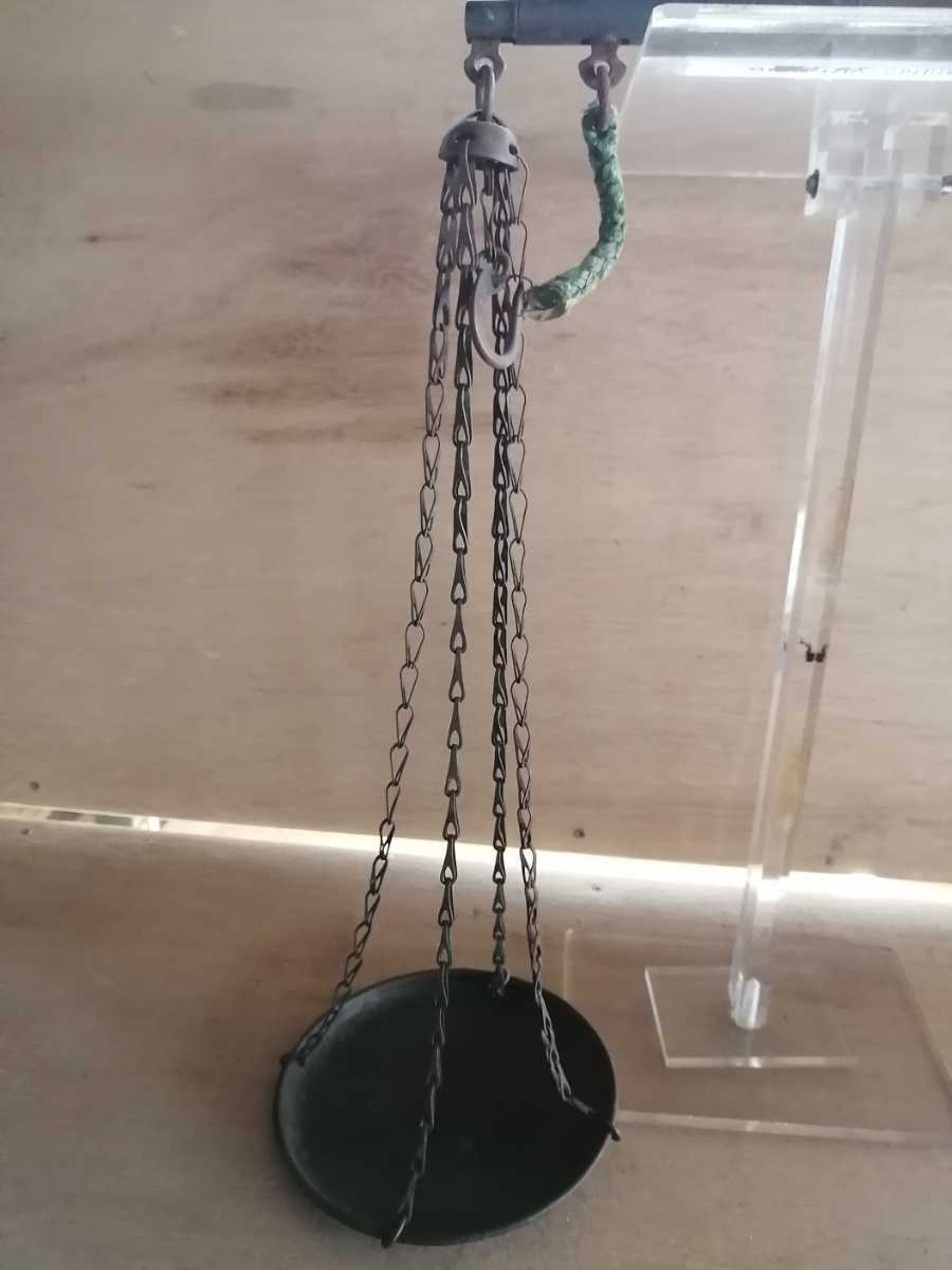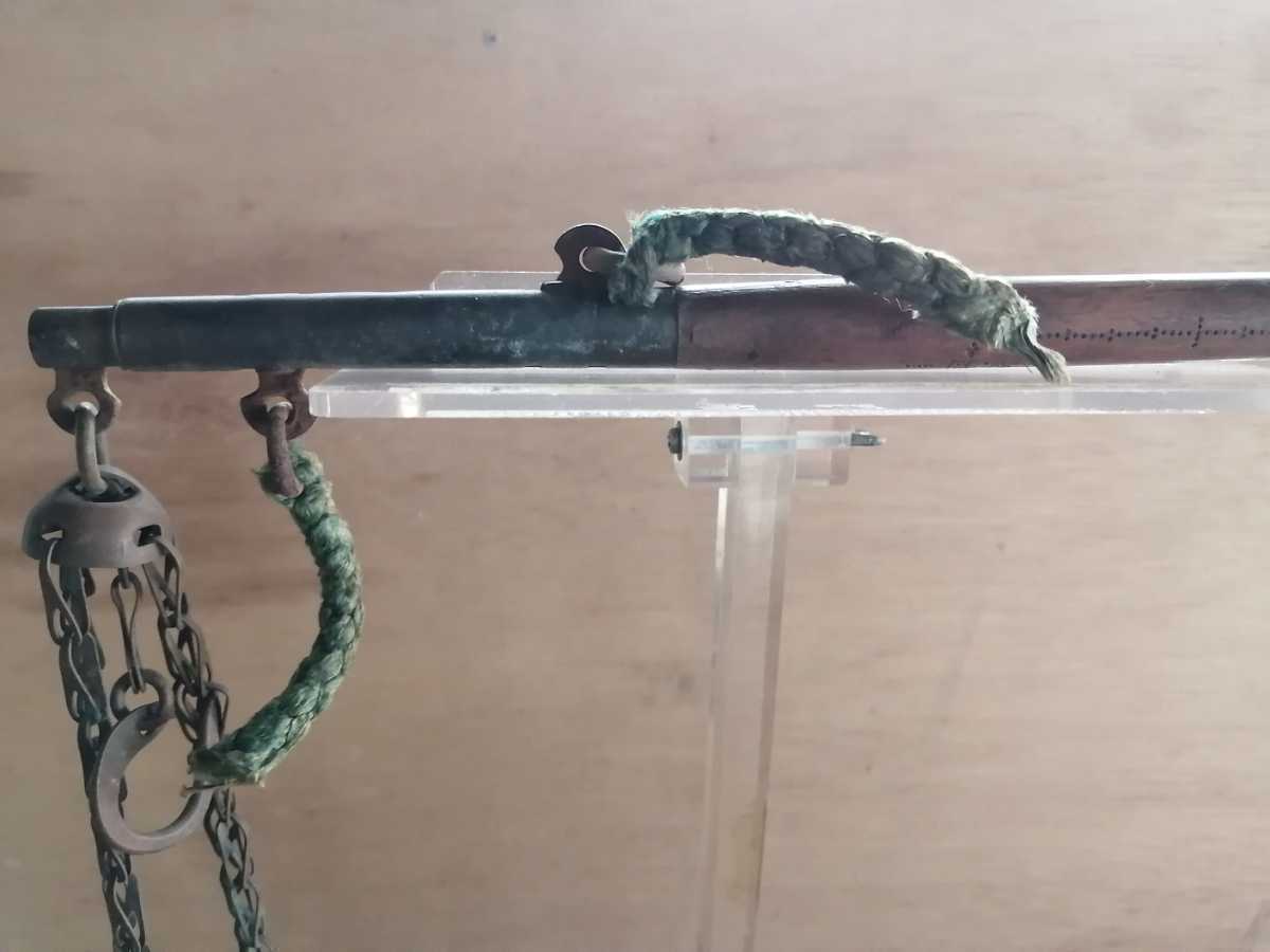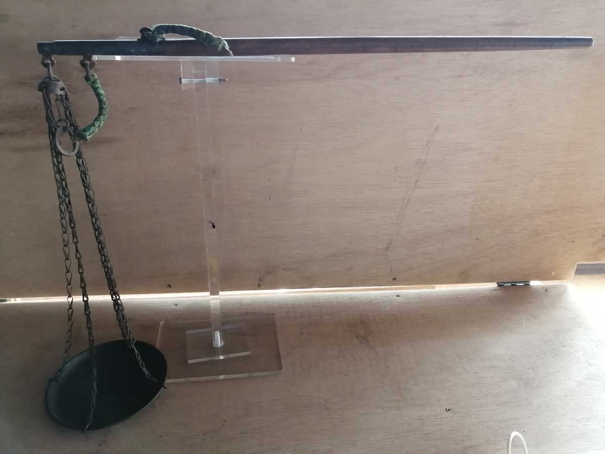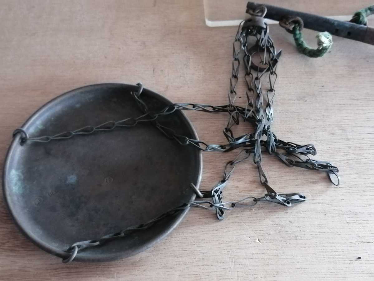 明治時代の丸皿秤です。銅の丸皿が三角形の銅鎖が繋がっています。緖紐は二ヶ所、皿に〇ヘ、埼玉〇武の刻印があります。時代を経てまだ使用に耐えうる道具です。皿径12㌢長さ43.5㌢重さ166㌘