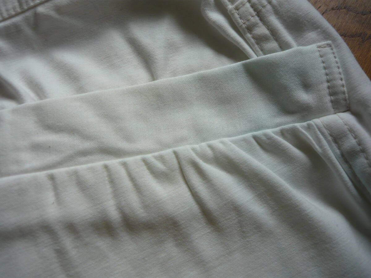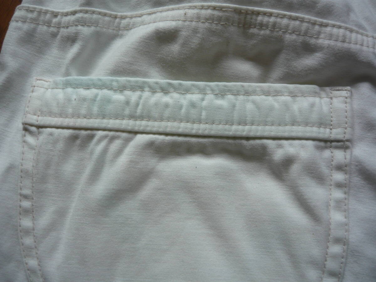 画像4のように左側の前ポケット付近に、画像5のように後ろポケット左側にお洗濯で色移りしてしまい,薄い水色のような色が付いてしまいました