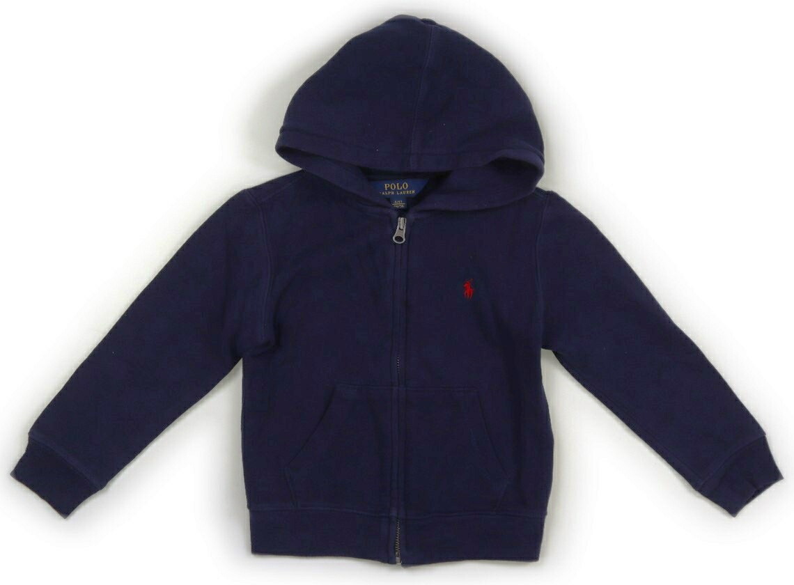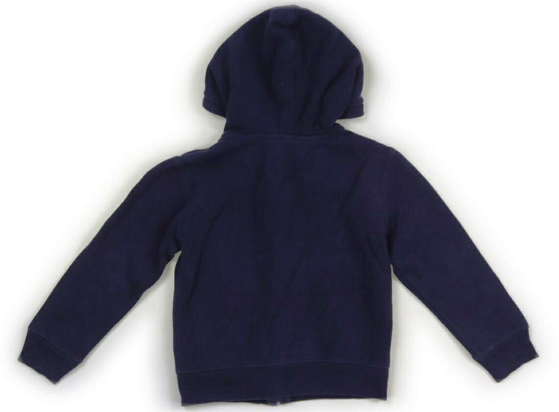 ポリエステルコットンのスェット生地。実際のサイズ表記は4/4T。本体の裏地は起毛生地、フードの裏地は綿生地です。全体に色あせ・毛羽立ち、胸元に油染み、袖リブに白っぽい汚れあり。外遊び用にいかがでしょうか。