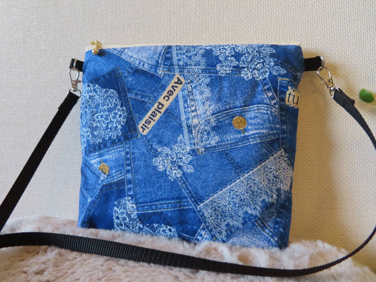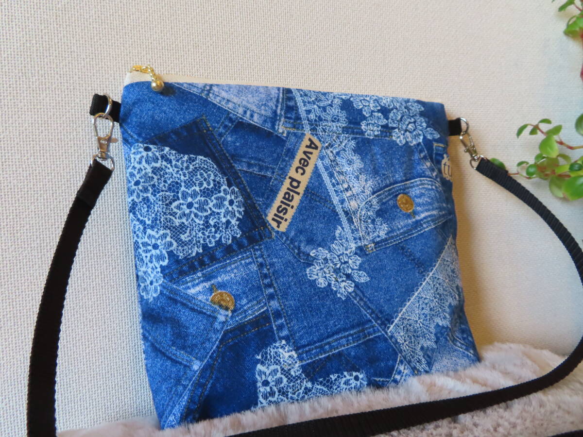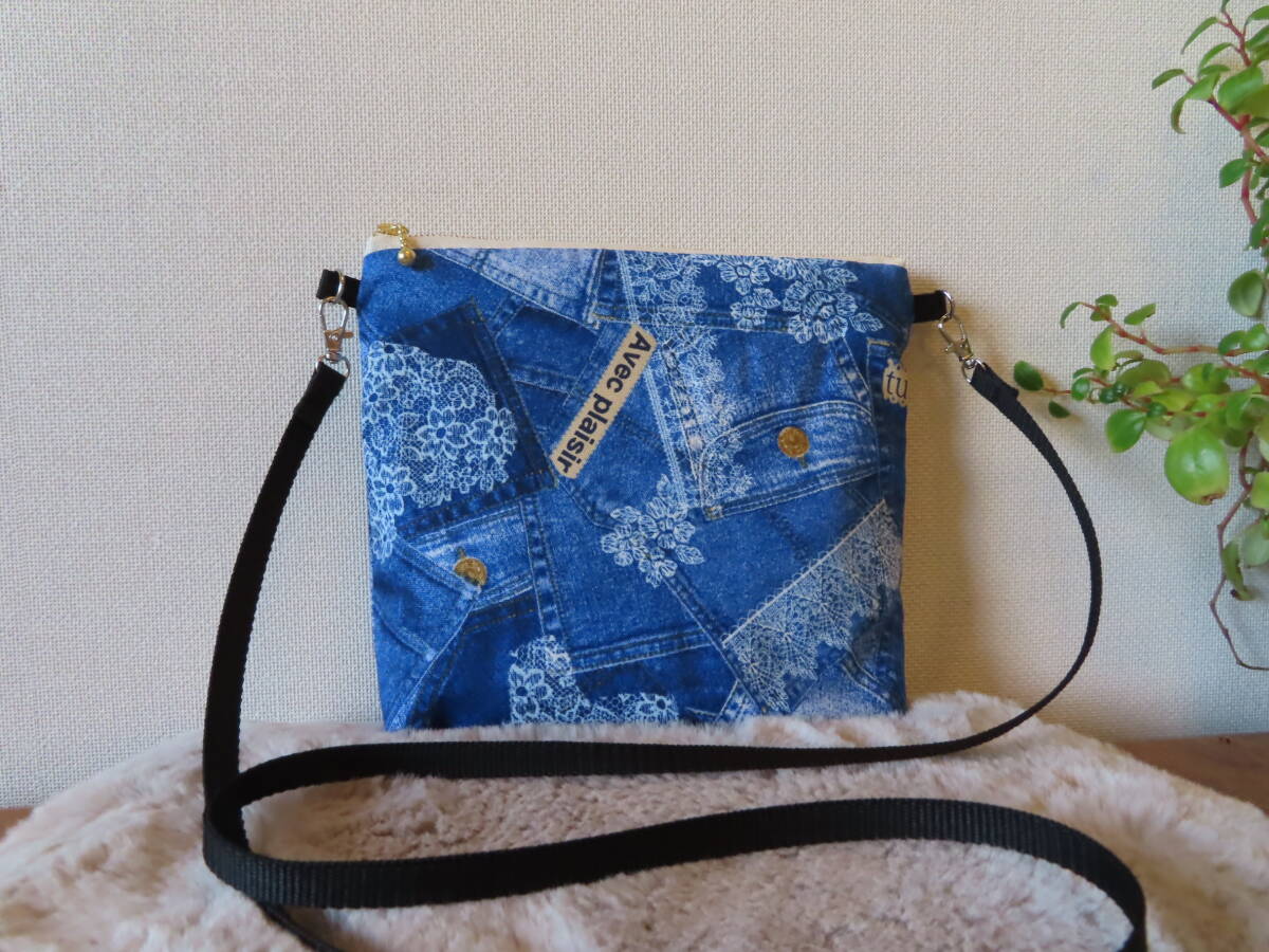2 ハンドメイド ミニ ショルダーバッグ ポシェット 軽いサコッシュ デニム風レース 柄 プリント