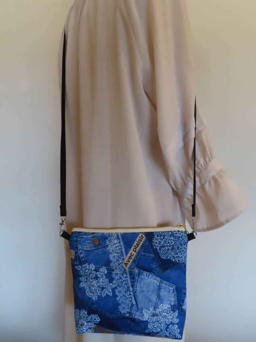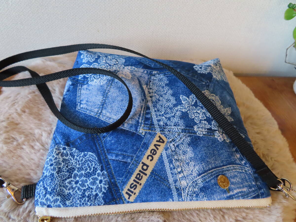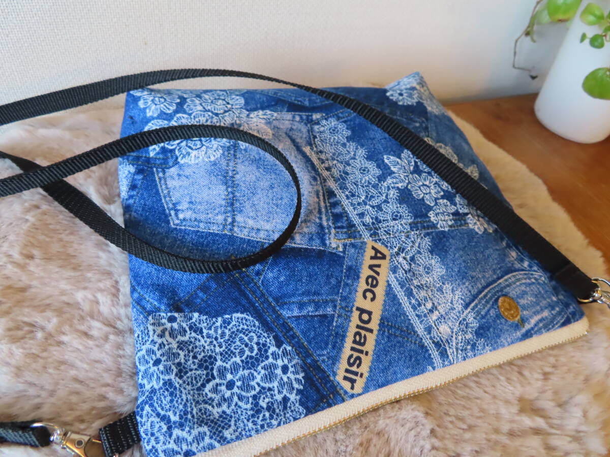2 ハンドメイド ミニ ショルダーバッグ ポシェット 軽いサコッシュ デニム風レース 柄 プリント