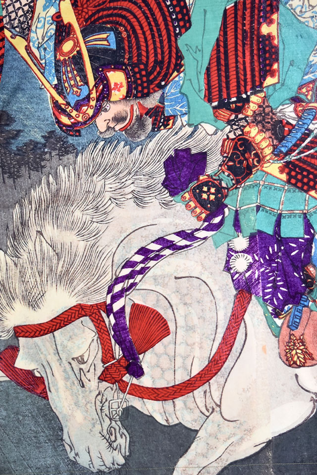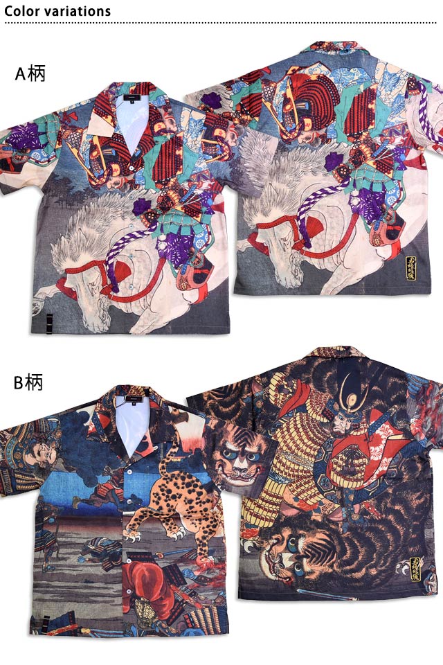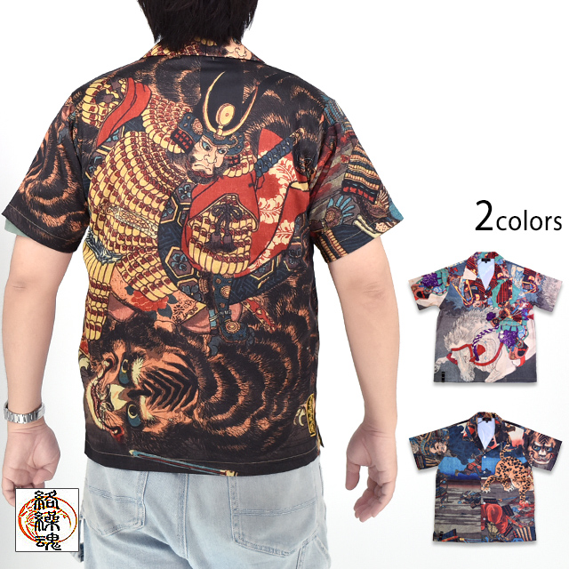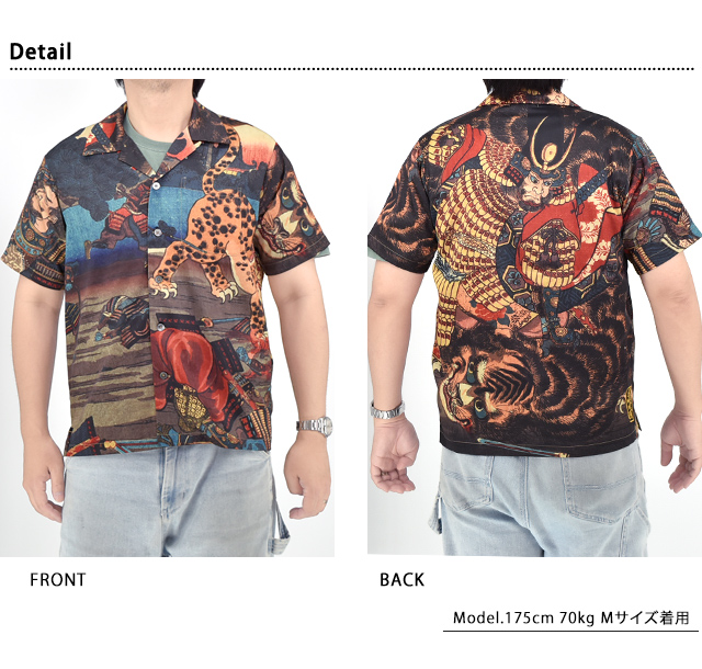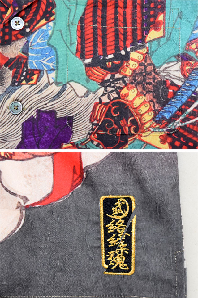 絡繰魂さんから「戦国浮世絵シャツ(252052)」のご紹介です。 浮世絵テイストでデザインした戦国将軍をシャツ全体に総柄で落とし込んだ、インパクト抜群の半袖シャツです。 昇華転写プリントを用いることで、発色も良く、柄もはっきりと見てとれる仕様になっています。 生地には、ポリエステル生地を採用し肌離れが良く暑い夏も快適な着心地の一枚に仕上げました。 ボディーには、さらりとしたポリエステル生地を採用。 左胸にはポケットが縫い付けられています。 バック裾には、ブランドロゴを印風に刺繍しました。 今回は刀ですぱっと切られた、特別バージョンになっています。 | |||||||||||||||||||||||||