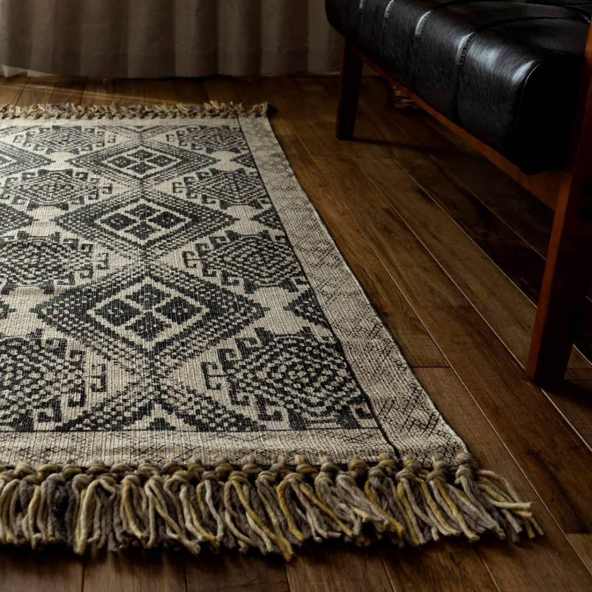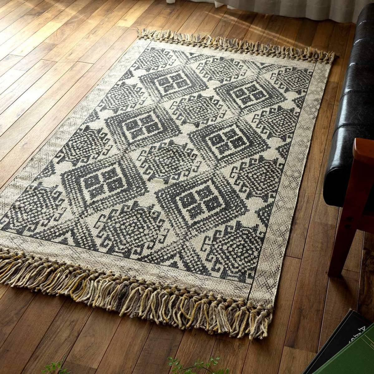 幾何学模様の伝統デザイン『キリム柄』のおしゃれなプリントコットンラグです、クールでスタイリッシュな塩系・男前インテリアにマッチします。
