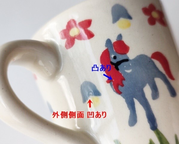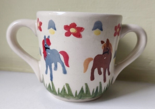 ポーランド ボレスワヴィエツ陶器 グレー/茶ポニー 花柄 両持ち手付きマグ0.2Lです。