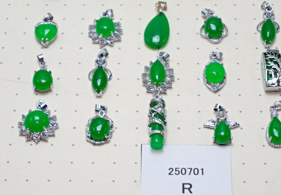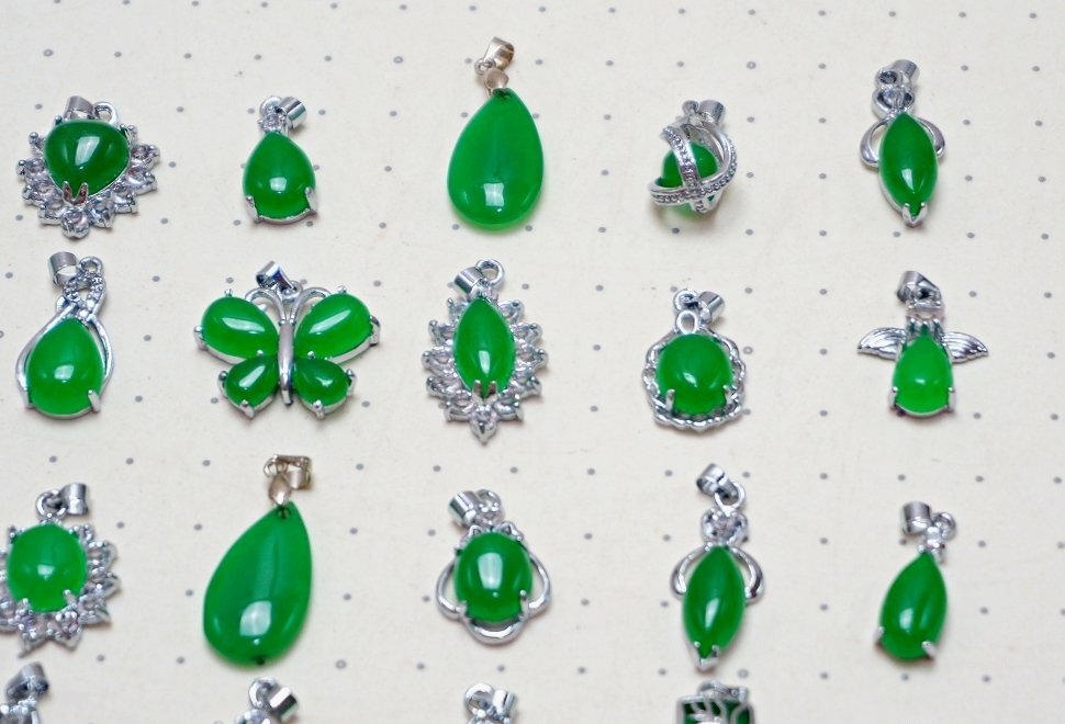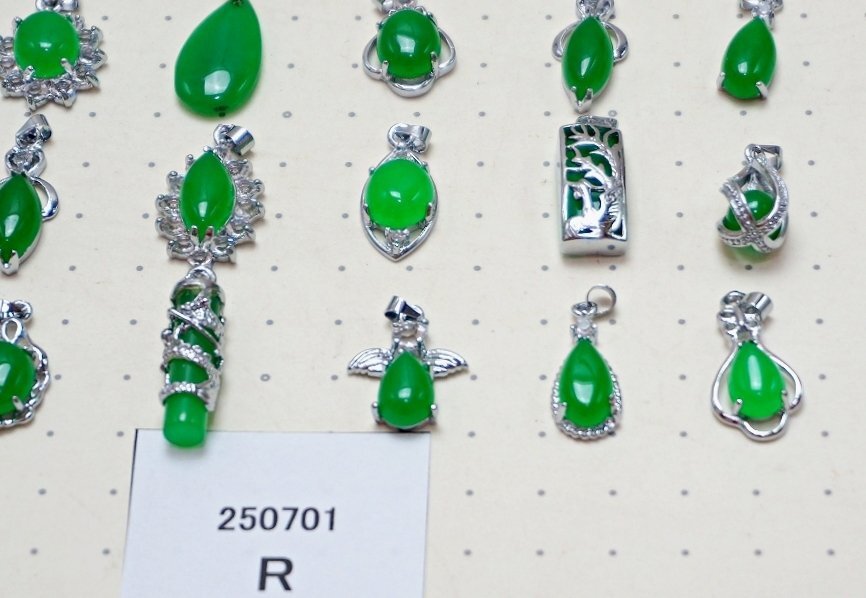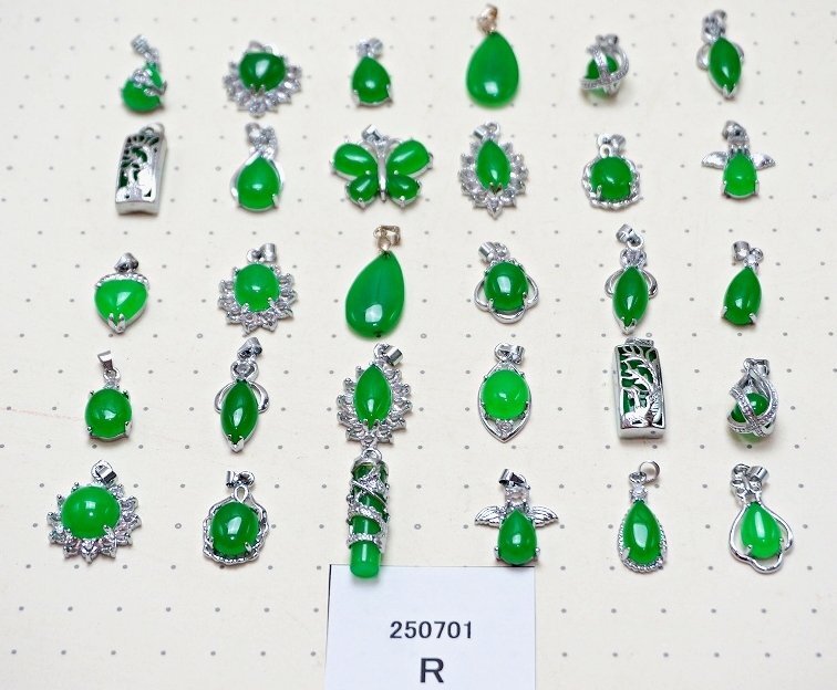 天然 緑石 ペンダントトップ まとめて30点セット 天然石のペンダントトップ 30点セットです。 とても丁寧に研磨されており、艶、色味ともに非常に美しいものです。 写真がお譲りする商品の全てになります。 材質: メノウ 玉髄 マレー翡翠 等の天然石 サイズ: ペンダントトップが置かれている下地の模様の点の間隔が1cmですので、参考にしてください。 個数: 30点 当店の他の出品商品との同梱料は下記のとおり落札1点につき200円です。 |