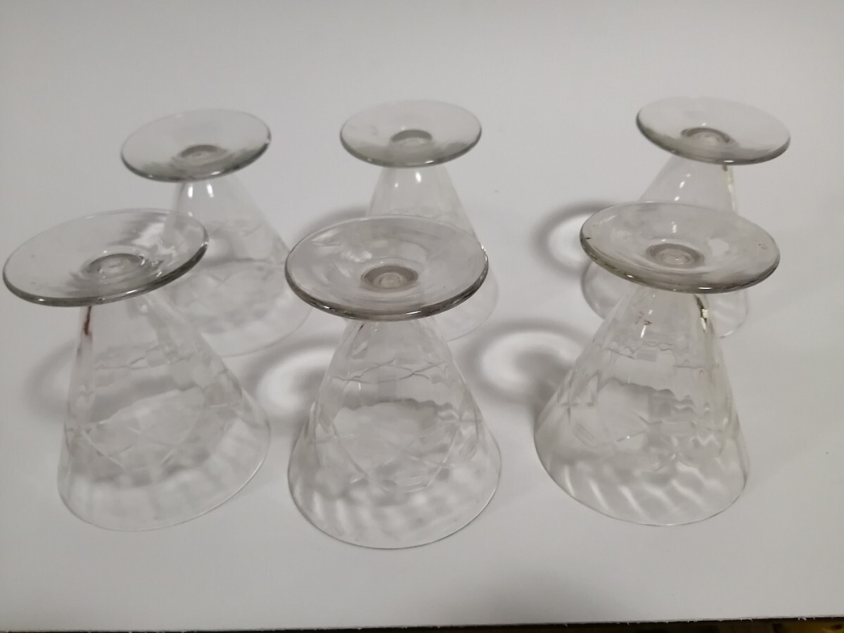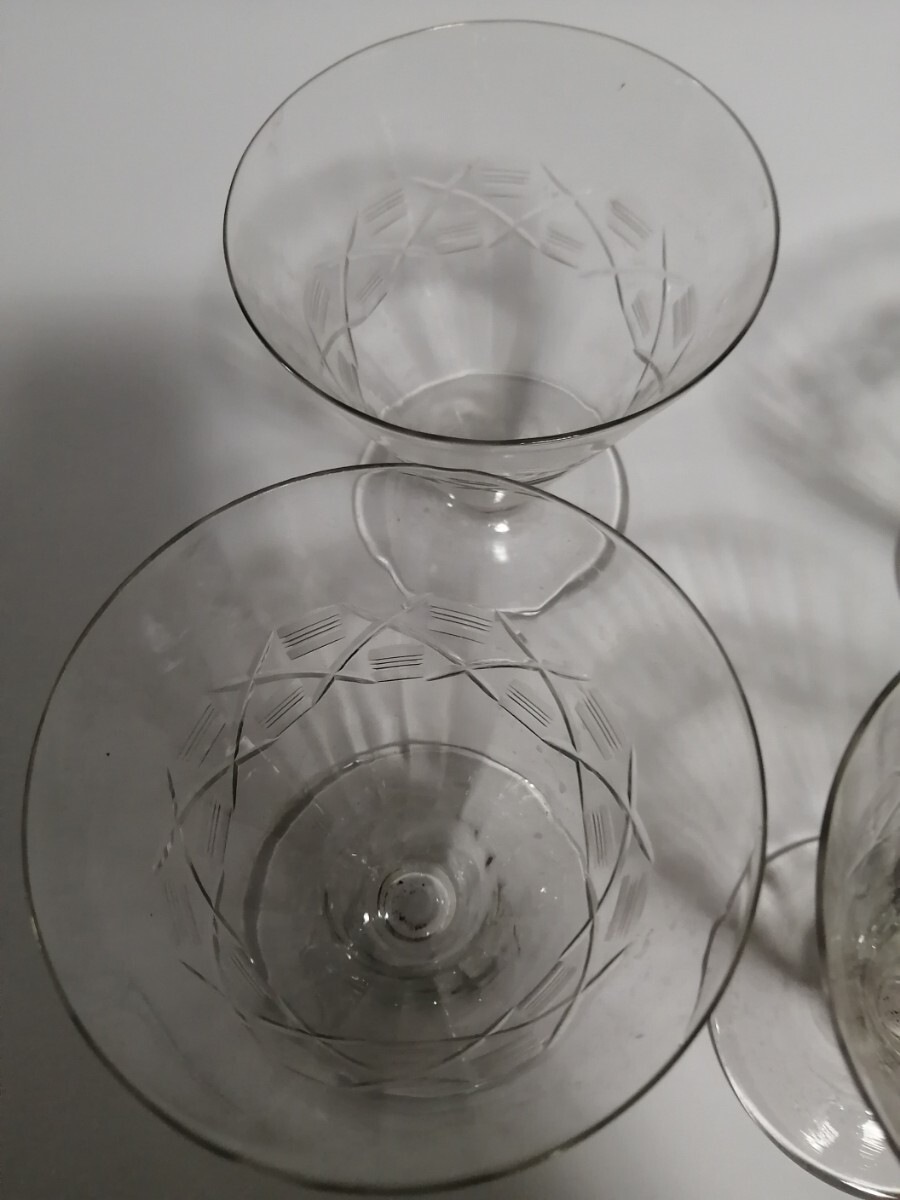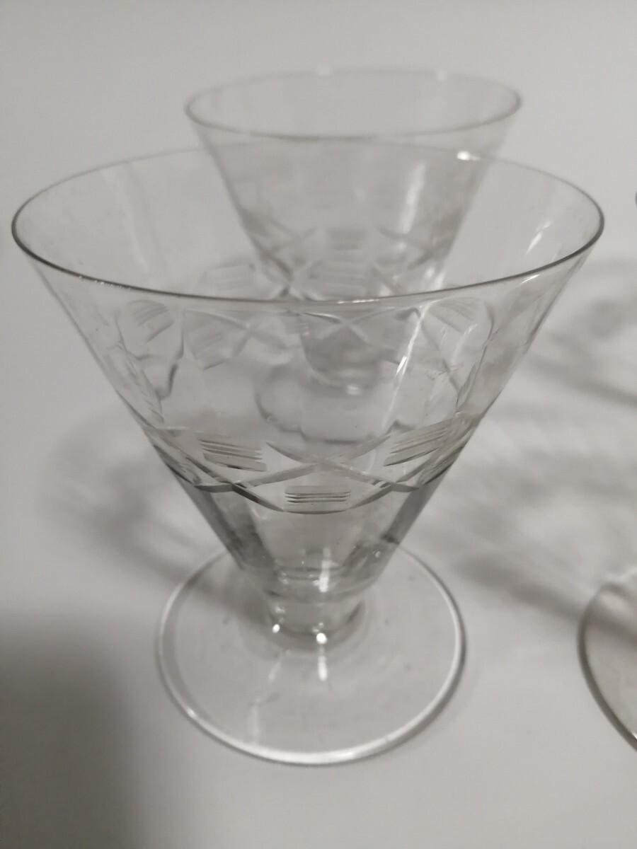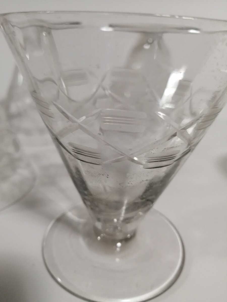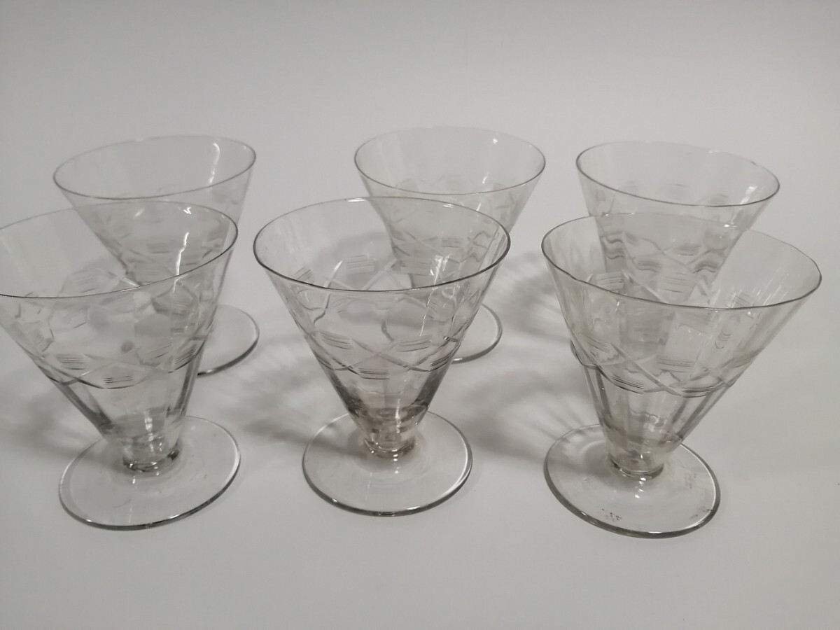 1930年代ベルギーの、ワイングラス6客です。丈の低く口が開いた安定した形のグラスです。薄い凌ぎがある本体に、グラインダーで模様が刻まれています。上品で扱い易いグラスです。カクテルグラスとしても使えます。口の部分に小さな当たりがあります。径9.1㌢高さ10㌢125㌘