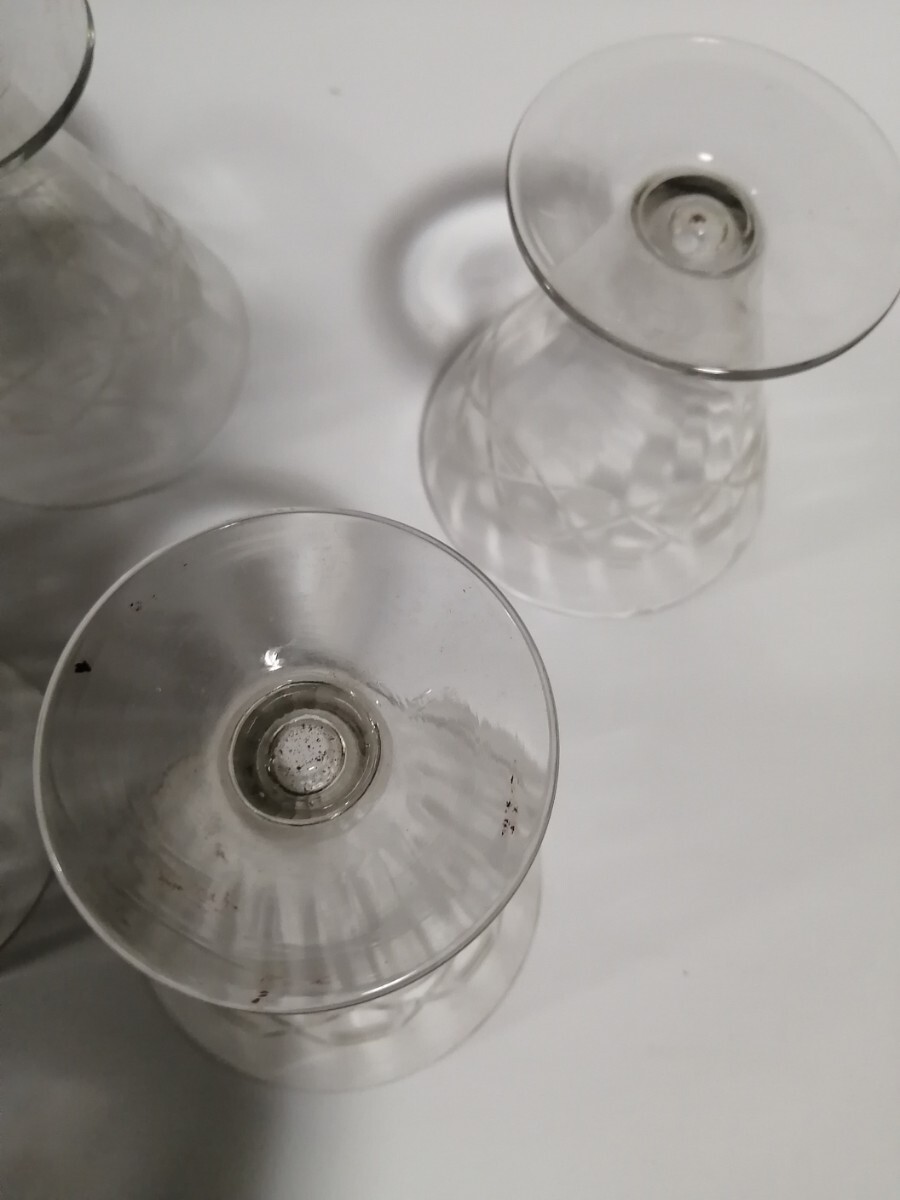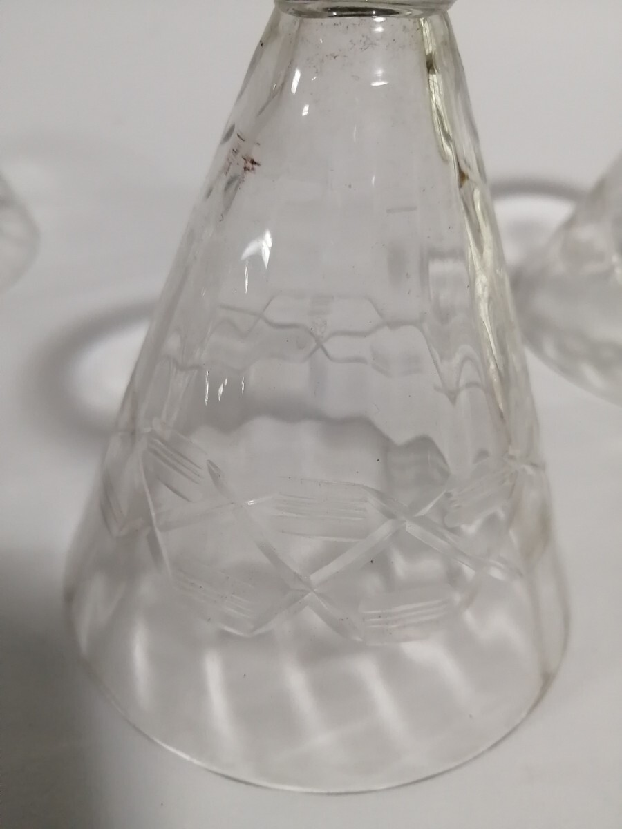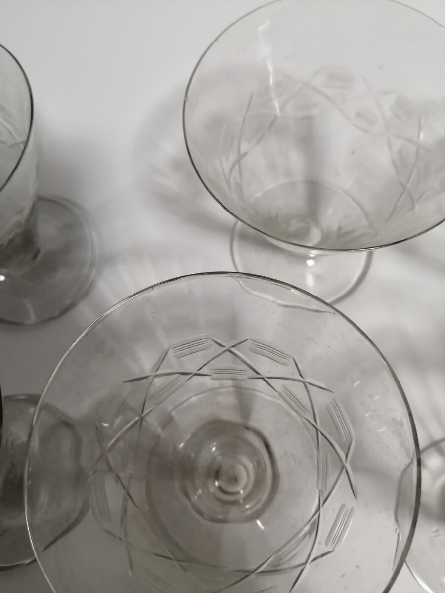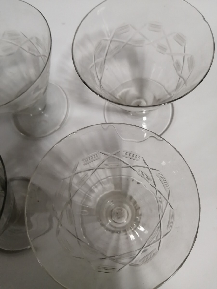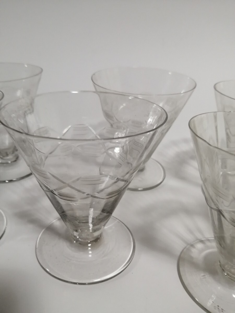 1930年代ベルギーの、ワイングラス6客です。丈の低く口が開いた安定した形のグラスです。薄い凌ぎがある本体に、グラインダーで模様が刻まれています。上品で扱い易いグラスです。カクテルグラスとしても使えます。口の部分に小さな当たりがあります。径9.1㌢高さ10㌢125㌘