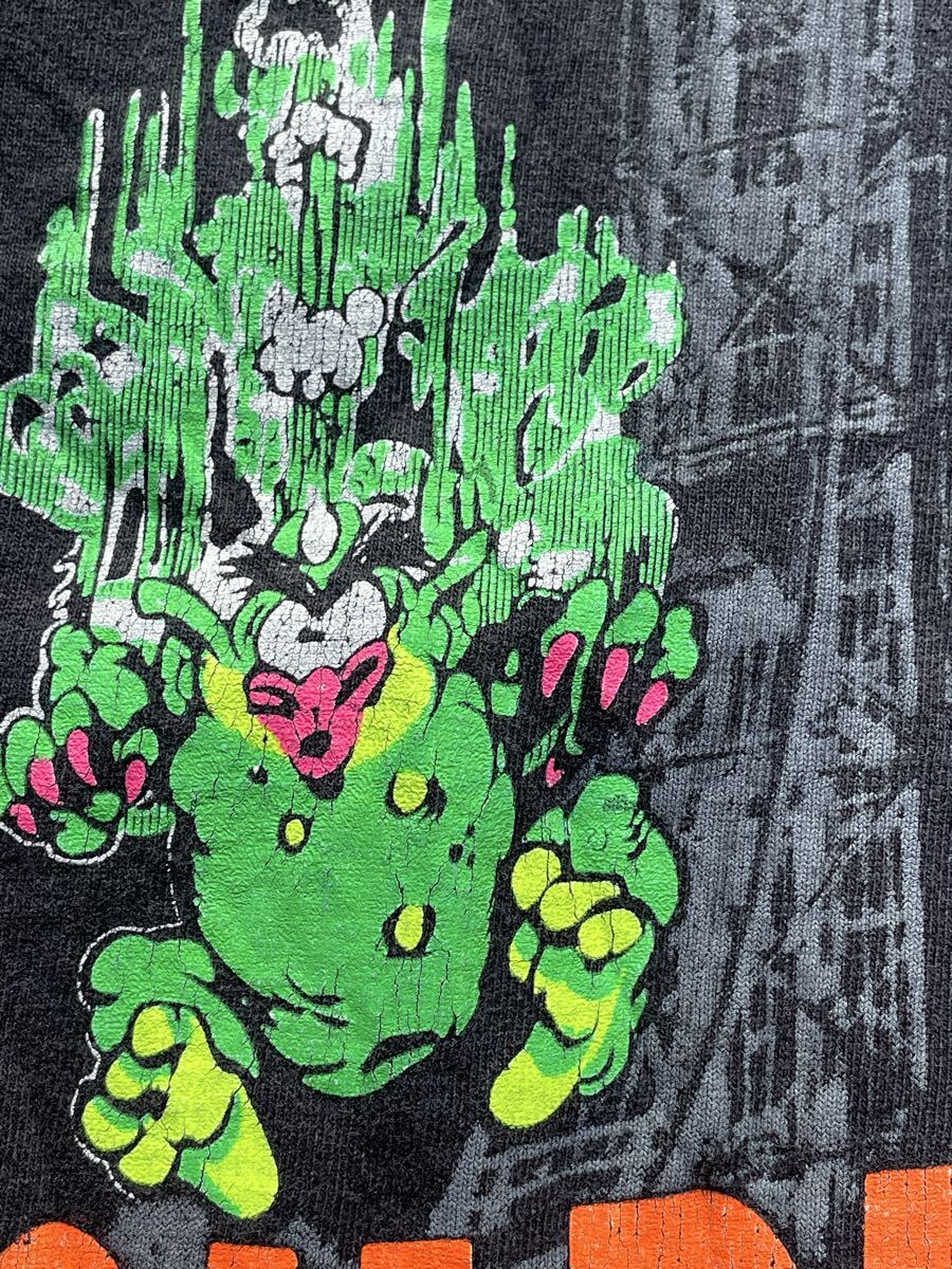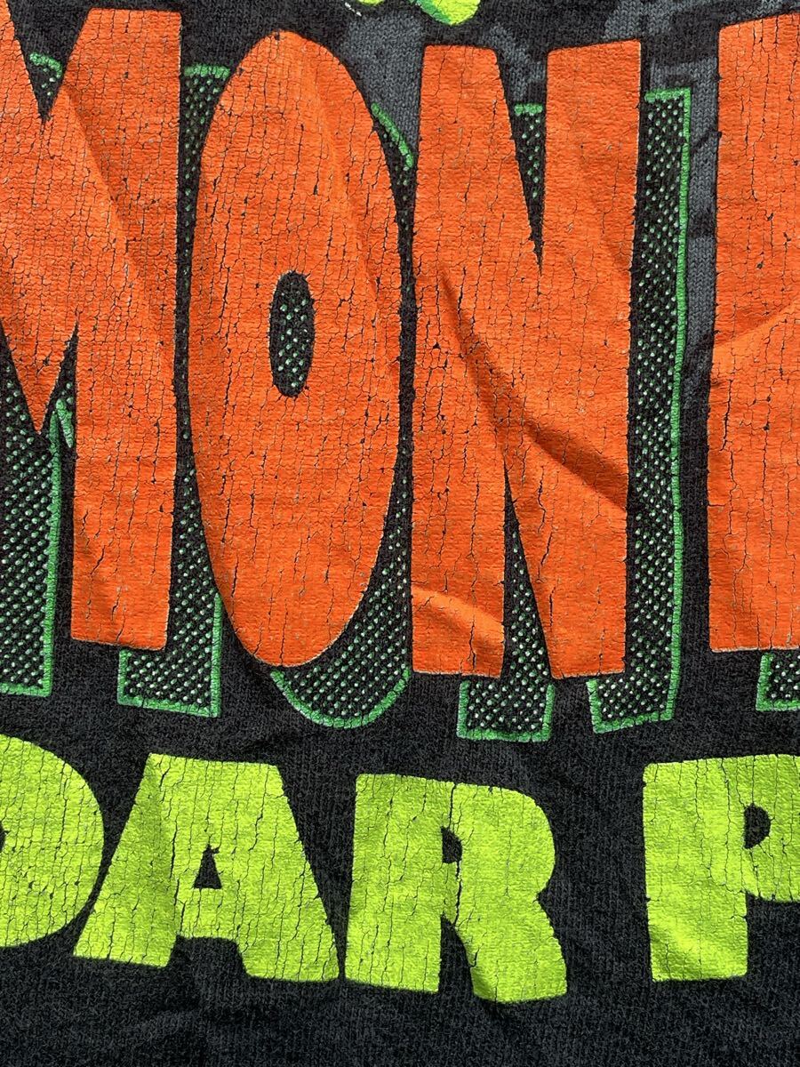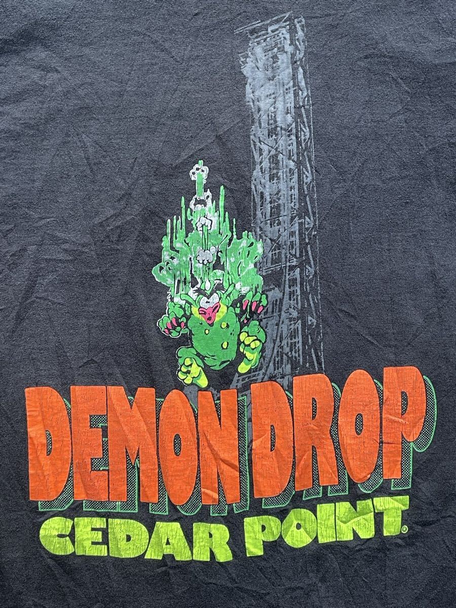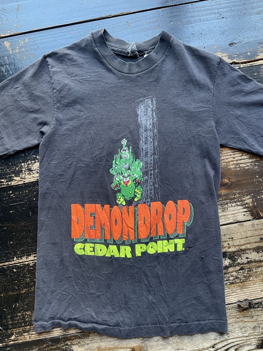 80年代〜のペンシルバニア州の遊園地のフリーフォールDEMON DROPのTシャツ。USA製 素材はコットン 袖と裾はシングルステッチ プリントは油性 サイズはS位 肩幅39.5cm 身幅42cm 袖丈(肩から)20cm 着丈63cm ダメージは後ろ見頃中央下辺りに破れ 右袖脇近くのステッチ沿いにステッチ抜け プリントに多々ヒビ割れ 全体的に色褪せ その他にもダメージ等ありますがご使用には問題ないです。フリーフォールから落ちるモンスターのキャラクター良くプリントの配色も良いと思います。サイズ小さいので女性にも良いと思います。ダメージ物になるのでご理解ある方のご入札お願いします。お好きな方よろしくお願いします。