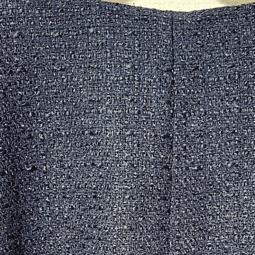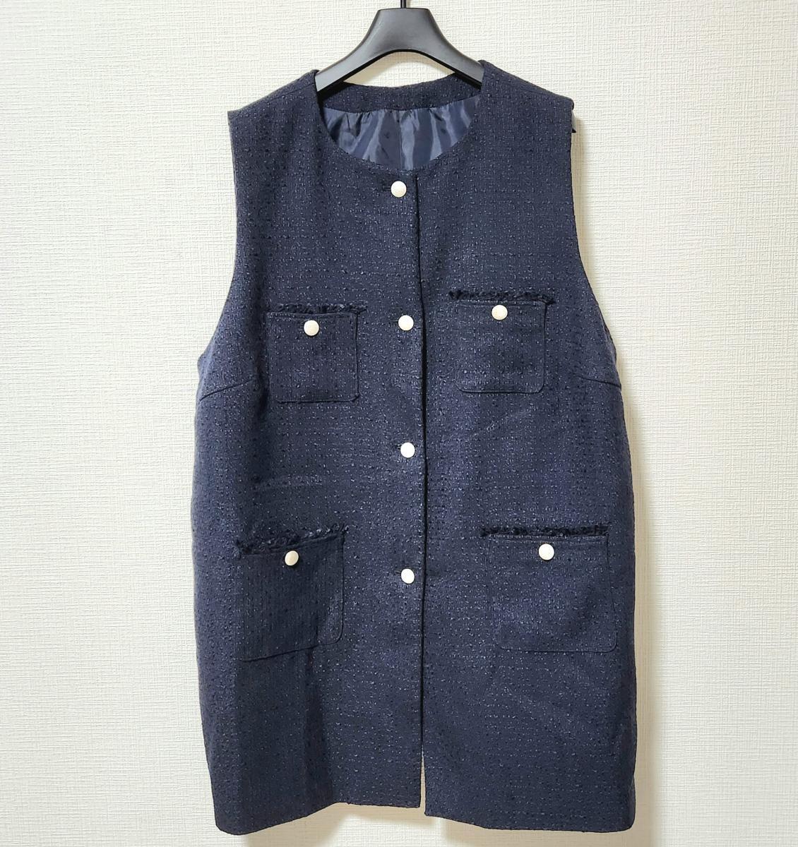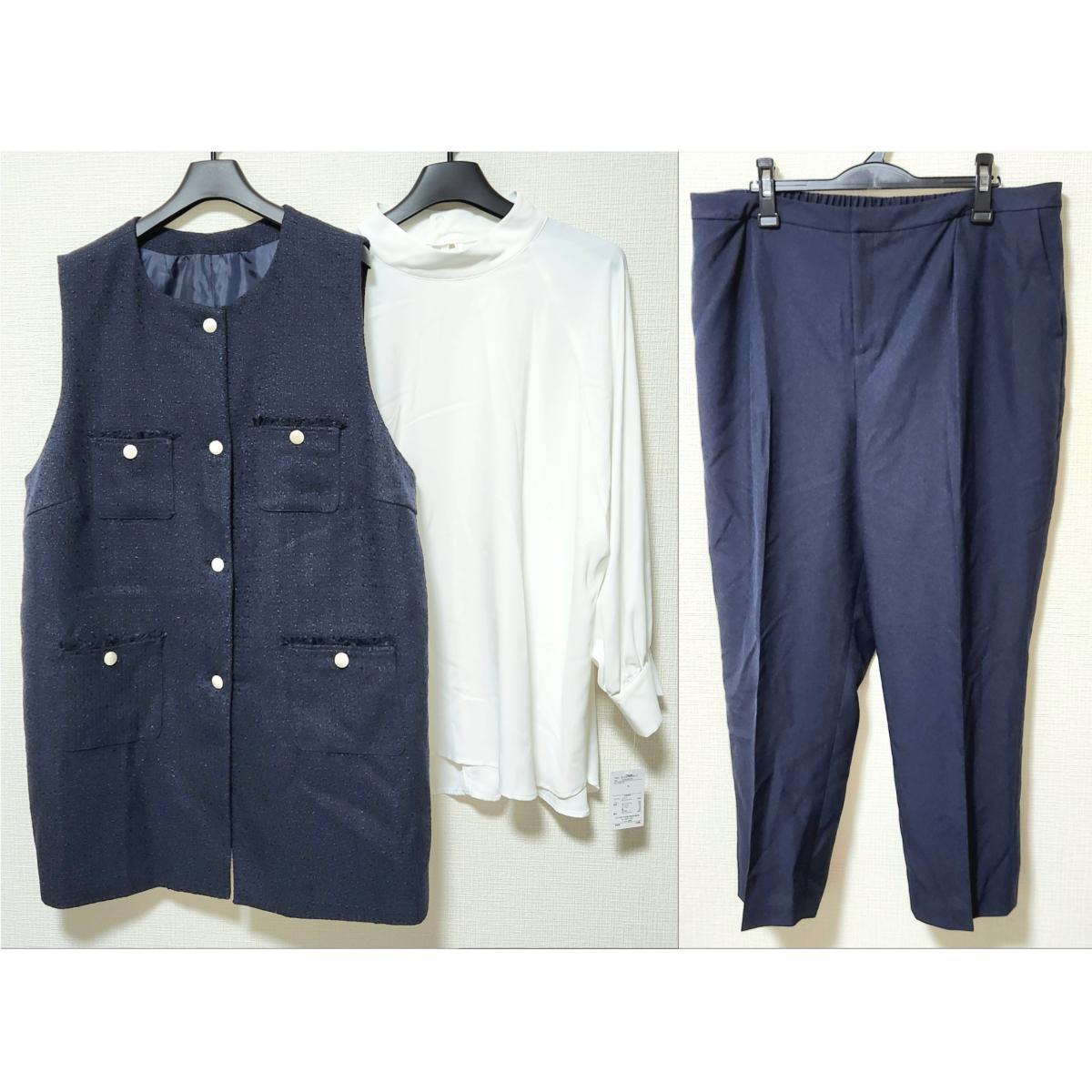 ツイード調のロングベスト、ホワイトのブラウス、テーパードパンツの3点セットです