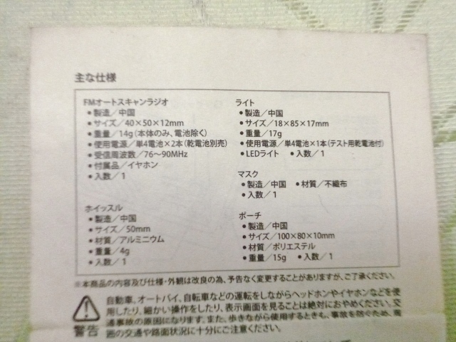 | 携帯用防災キット おともし隊 ミニ です。 中古品ですが、状態は良いほうだと思います。 付属のマスクは使ってしまいましたので、ございませんが、 FM専用オートスキャンラジオ、LEDライト、ホイッスル、ポーチのセットになります。詳しくは、こちらをご覧くださいませ。 画像にあるもので全てです。 状態につきましては、画像をご覧くださいませ。 格安の580円スタートです。よろしくお願いいたします。 |