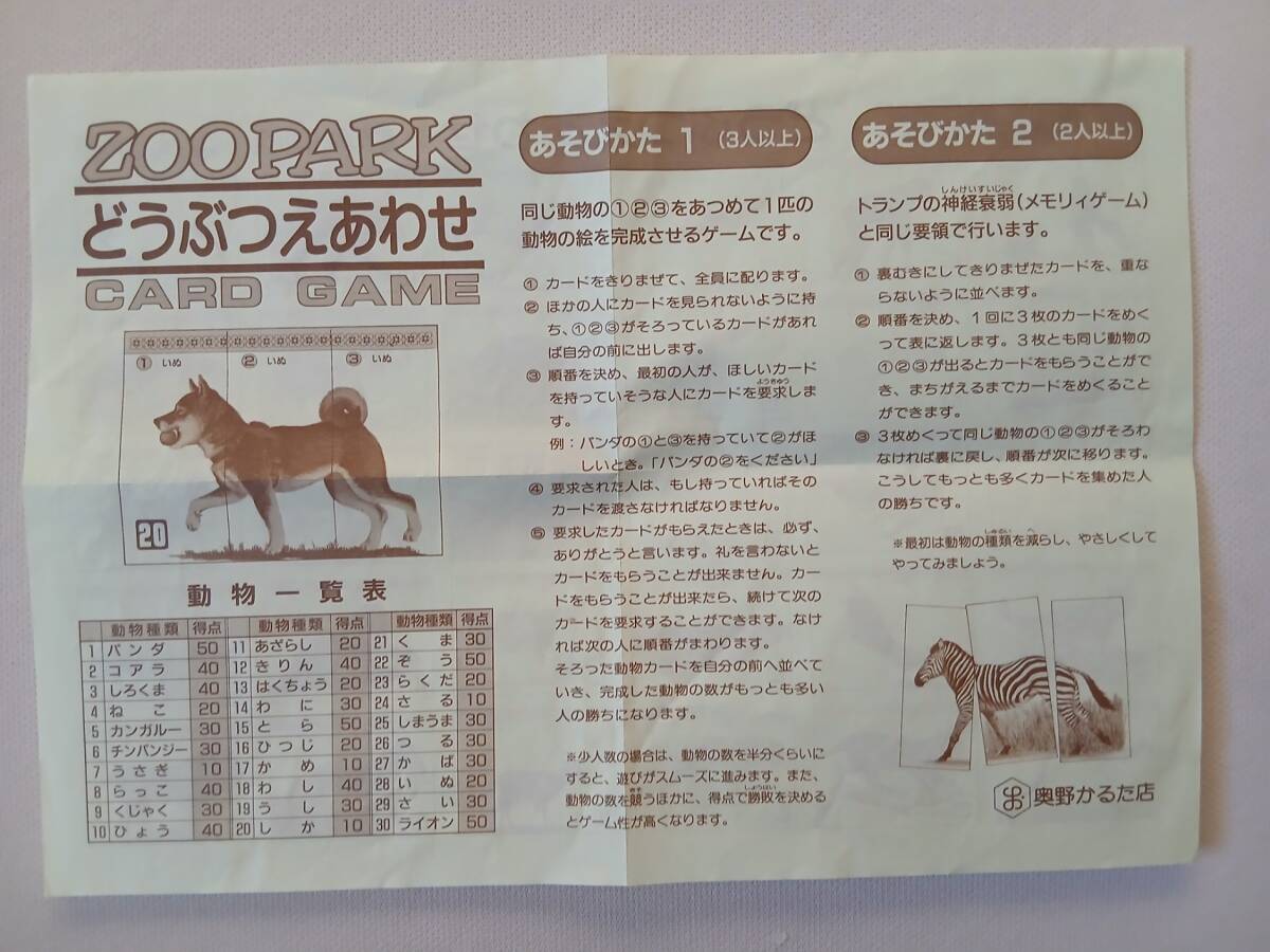 ★ZOO PARK どうぶつえあわせ カードゲーム です。今から15年(?)ぐらい前に購入した品だと思います。購入して解説書を読み、中身を確認しただけで、本棚にしまっておいた新品同様の品となります。以上をご了解の上、ご入札ください。
