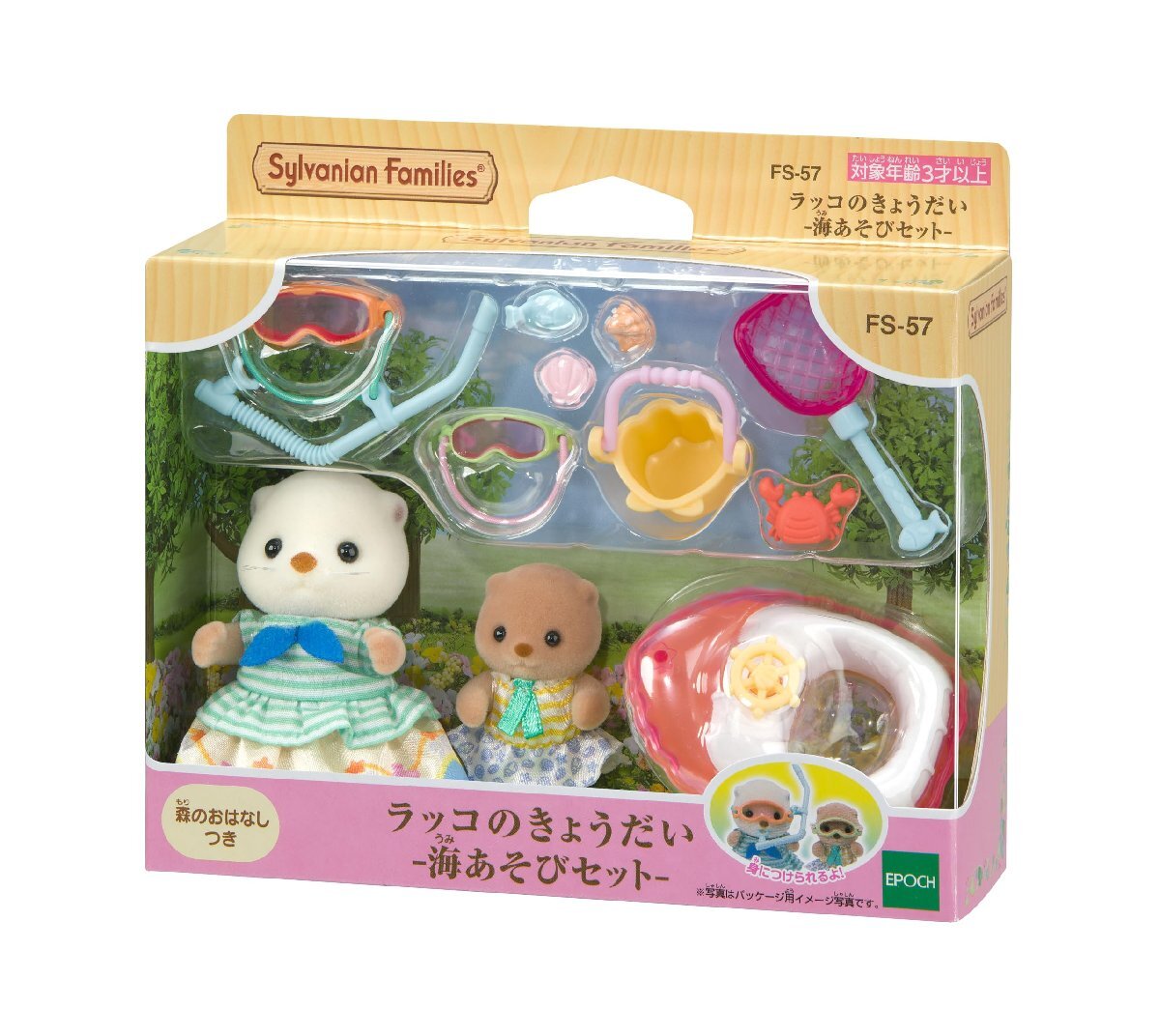 「シルバニアファミリー 人形・家具セット 【 ラッコのきょうだい -海あそびセット- 】 FS-57 STマーク認証 3歳以上 おもちゃ ドールハ」▼4905040156389▼(商品説明)ラッコ・きょうだい フリーサイズ FS-57・・Style:ラッコPatternName:きょうだい・丸くてかわいいラッコの女の子と赤ちゃん、海あそび小物のセットです。・ベビーボートやシュノーケル、魚とりなど、海あそびしているシーンを楽しめます。・(C)EPOCH説明 商品紹介 *ベビーボートには赤ちゃんを乗せられます。シュノーケルは女の子が身に付けられます。 *ラッコの女の子のワンピースは、スカートを取り外すと水着に変身します。 *魚とりあみでは、貝や魚、カニをつかまえられます。 *マリーナは泳ぐのが大好きな、活発な女の子。お洋服は、スカートを取ると水着になる特別製。泳げそうな場所があると、サッと水着になって飛び込んでしまいます。 海の中でくるくる回りながら泳いだり、潜って石や貝を集めるのが好きで、お気に入りの石や貝をポケットにいつも入れていますが、泳いでいるうちに落としてしまうことも。 マノンはマリーナと一緒に海で遊ぶのが好きな赤ちゃん。いつかお姉ちゃんのようにぐんぐん遠くまで泳げたらいいな、とおそろいのゴーグルをつけて、水に顔をつける練習中です。 海に遊びに行くと、ベビーボートで「おもかじ、いっぱーい!」と船長さんごっこをしています。 *別売りの「ラッコファミリー」と一緒に遊ぶと家族が揃ってもっと楽しく遊べます。 安全警告 ●小部品があります。誤飲・窒息の危険がありますので、3才未満のお子様には絶対に与えないでください。