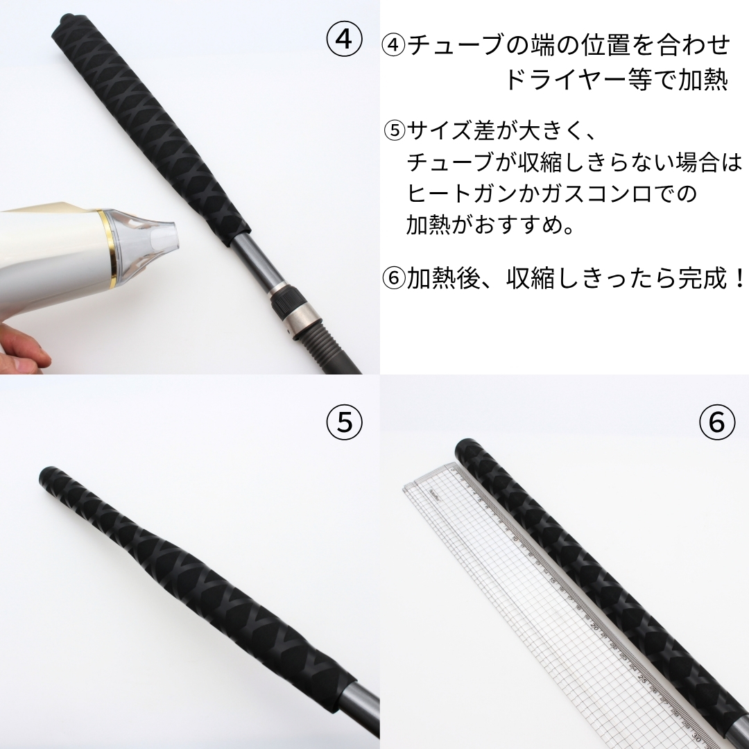 ドライヤーで施工する場合は、対象のグリップ直径より最大+3㎜以下の直径サイズのチューブをお選び下さい。