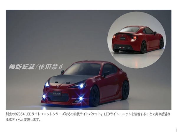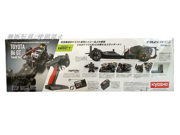 ご覧頂きありがとうございます、出品物は、KYOSHO 1/10 EP 2WD フェーザーD2 FZD2シリーズ レディセット トヨタ 86 GT チューンド・バージョン ライトニングレッド 34502T1(ドリラジ/ドリフト)プロポ/メカ付き、塗装/組立済み完成品 新品/未開封品になります。 先日、新発売(完全新設計ドリフト専用)新企画販売されたAE86トレノに続くFZD2シリーズ第二弾の新製品となります、新品購入後未開封のまま個人保管している物となります。 フェーザーD2 FZD2シリーズ レディセット製品は、メーカーにてシャーシ組立/ボディ塗装/デコレーション等された販売時から完成SET品となります、シャーシ/ボディ以外に、メカ/モーター/プロポ等付属されており、別売りの走行用バッテリー/バッテリー充電器/送信機用単3乾電池4本をご用意頂ければ、商品開封後ただちに走行可能なモデルです。 ※本セットには、走行用バッテリー/充電器/送信機(プロポ用)単3乾電池4本は付属しておりません、別途ご準備下さい。 【商品状態】 新品/未開封 【商品詳細】 メーカー:京商 品名:1/10電動RC 2WD フェーザーD2 FZD2シリーズ レディセット トヨタ 86 GT チューンド・バージョン ライトニングレッド 完成品 メーカー品番:34502T1 【主な付属品】 プロポ(送信機)2.4GHz メカ類(サーボ/受信機/ジャイロ付きスピードコントローラー/モーター等) デコレーション/塗装済みボディ 組立済みシャーシ <キット内容> ●R/Cユニット組込み済み工場完成シャシー ●カラーリング・デカール・組み立て済みボディ ●シンクロKT-231P+送信機 ●1.5mm/2.0mm 六角レンチ ●十字レンチ(小) ●セッティング変更パーツ 完全新設計ドリフト専用シャシー&メカ搭載、これがドリフトR/Cの新たなスタンダード! パッケージから取り出して車体に充電したバッテリーを搭載し、送信機に乾電池を入れればすぐに走行可能な手軽さが魅力のFAZERシリーズのレディセットに、待望のRWDドリフトモデル『FAZER D2』が登場します! リア2輪駆動(RWD)は、現在の1/10スケールドリフトR/Cカーで最もポピュラーな駆動方式で、実車さながらに大きくカウンターステアを切ってドリフトする姿が高い人気を集めています。こちらのFAZER D2は、従来のFAZERシリーズとは全く異なるドリフト専用RWDシャシーを採用し、重量配分やサスペンションの設計をドリフトに最適化すると同時に、車体のスライドに応じて自動的にカウンターステア操作などを行ってくれるジャイロユニット内蔵型の受信機も装備しています。注目はこのジャイロがステアリングだけでなくスロットルの制御も行うことで、これまでドリフトR/Cカーを操縦した経験のない人も完璧にサポートします。もちろんシャシーも快適なドリフト走行を実現するため、ロングスパンサスアームやハイマウントモーターの採用など、近代ドリフトR/Cカーのトレンドを取り入れつつ扱いやすさやセッティングにも配慮。完成済みレディセットであっても、パーツの変更などによって本格R/Cカーならではのセッティング&チューンアップを楽しむことができます。ドリフト走行の雰囲気を高めるためには欠かせないボディは京商の誇るウルトラスケールボディで展開し、多彩なボディの搭載を可能にするホイールベース可変機能も搭載しました。従来は、ある程度の経験があるユーザー向けというイメージの強かった1/10スケールのドリフトカーですが、完成済みレディセットFAZER D2の登場によって一気に身近なものとなります。 『ULTRA SCALE BODY PLUS』とは? ボディ、ライトバケット、バンパー、ミラーを忠実に再現しており、クルマとしての造形の細部まで徹底的に作り込んだ “走るディスプレイモデル”とも呼ぶべき『ULTRA SCALE BODY』が、ポリカーボネートボディに穴を開けない『ULTRA SCALE BODY PLUS』としてスケールをさらに追求。 ●1/10スケールEP(電動)ドリフトカーの組み立て完成済みレディセット。送信機用単3乾電池4本、走行用バッテリー、走行用バッテリー用充電器を用意すれば走行可能。 ●ボディ塗装&デカール貼りやR/Cメカの組み込みも工場完成済みのため、購入後すぐに走れる手軽さが魅力。 ●ドリフト走行に特化した新設計RWDシャシーに、ステアリング&スロットルジャイロを装備し、誰でも簡単にドリフト走行を楽しめる。 ●スライド性能とコントロール性を両立した樹脂製ドリフトタイヤを標準装備。 ●新設計のジャイロ内蔵KRG-331D受信機とKS4072-06Wサーボを採用。 ●ホイールベース可変機構により、既存のFAZERシリーズボディのほとんどが搭載可能。 ●サイズの異なるバッテリーパックにも対応可能なバッテリーホルダーを装備。汎用のR/Cカー向けバッテリーパックのほとんどが搭載できる。 ●豊富なオプションパーツを利用したチューンアップも行える。 ■全長(ボディ含) 441mm ■全幅(ボディ幅 ※ミラー除く) 208mm ■全幅(シャシー) 208mm ■全高(ボディ含) 136mm ■シャシー高 12mm ■ホイールベース 260mm ※(240-273mm可変) ■トレッド(F)172mm ■トレッド(R)180mm ■ギヤレシオ 9.1:1 ■タイヤ(F/R