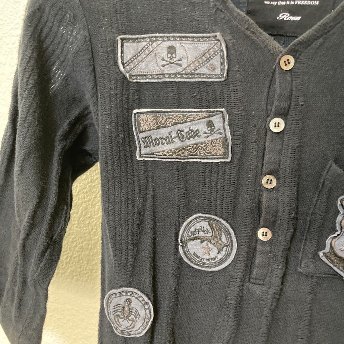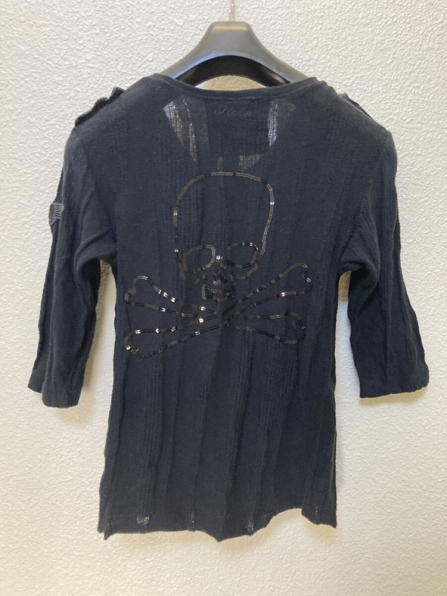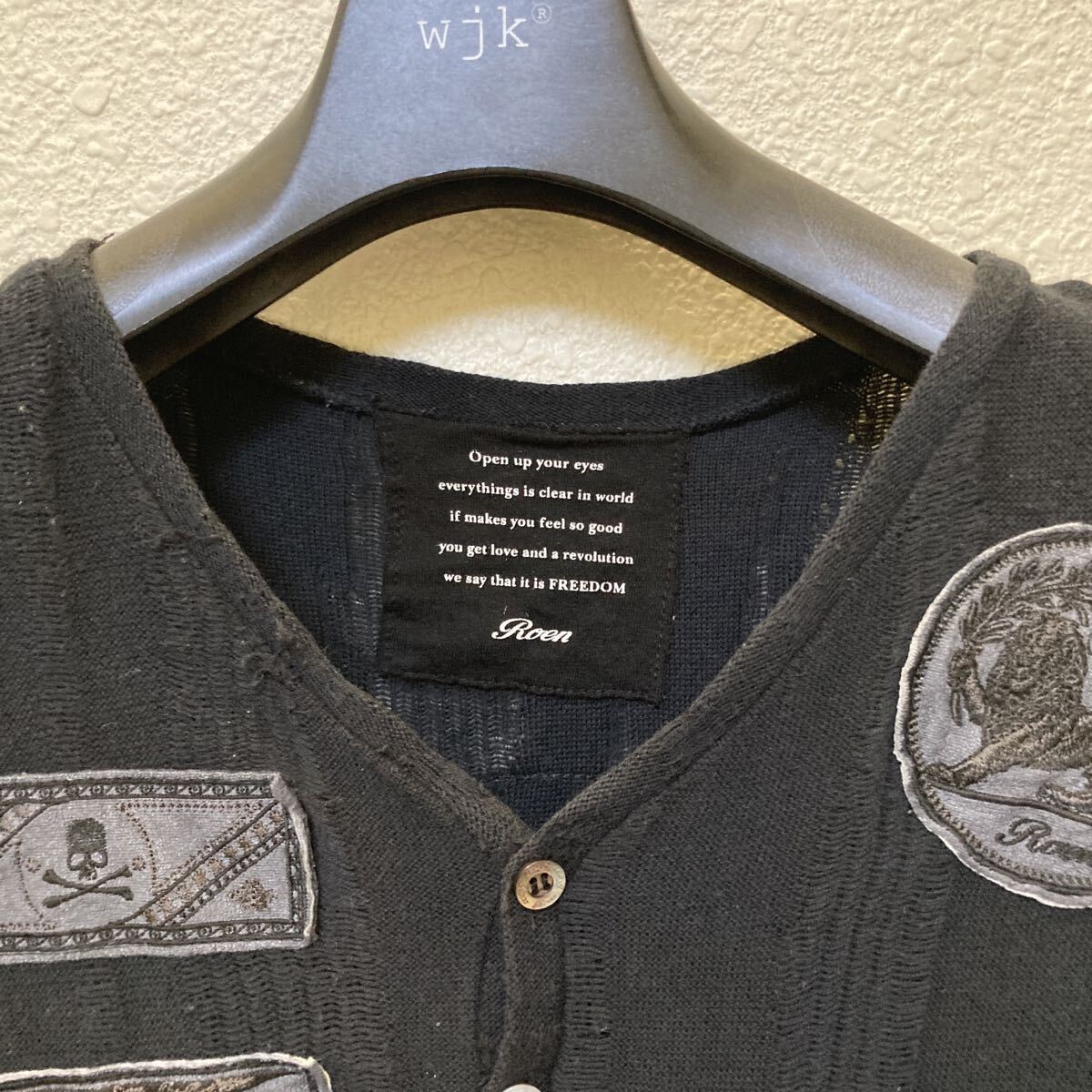 透け感のあるクラッシュ生地を使い背中にスパンコールでスカル、レザーのエポーレット、オリジナルのボタンやレザーに刺繍で表現された有名海外バンドなどのパッチを黒で統一した手の込んだ一着です。