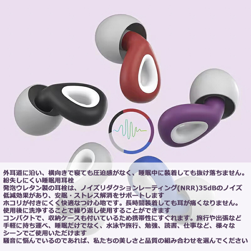 紛失しにくい睡眠用耳栓発泡ウレタン製の耳栓は、ノイズリダクションレーティング(NRR)35dBのノイズ低減効果があり、安眠・ストレス解消をサポートしますホコリが付きにくく快適なつけ心地です。長時間装着しても耳が痛くなりません。使用後に洗浄することで繰り返し使用することができますコンパクトで、収納ケースも付いているため携帯性にすぐれます。