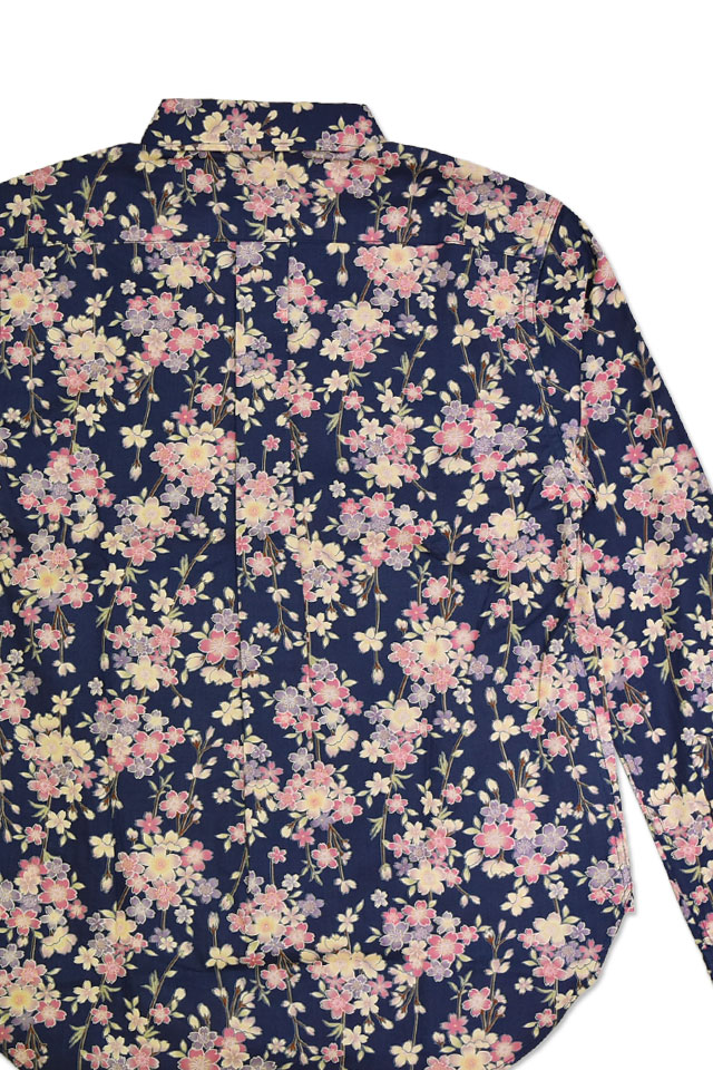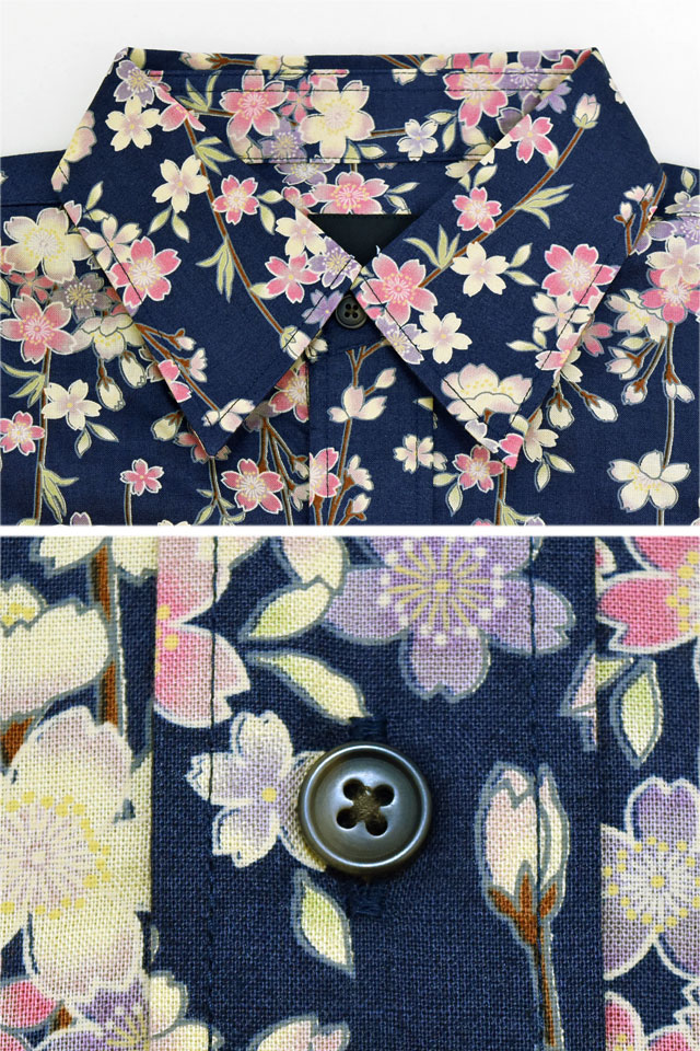 味わい深い物作りをされている衣櫻さんから、抜染調長袖レギュラーカラーシャツ「枝垂桜」(SA-1721)のご紹介です。 抜染調のアレンジが用いられた長袖シャツが登場しました! 柄には枝垂桜を採用。 落ち着いたネイビーのベースに、桜が美しく映えています。 ボディーには、さらりとした質感の薄手なシーチング生地を採用しました。 裾は中央の長いセンタープリーツ仕様。 一枚で着るのはもちろん、ジャケットやカーディガンのインナーとして着用するも良し、Tシャツやタンクトップの上からさらりと前開きで羽織るも良し。 | |||||||||||||||||||||||||