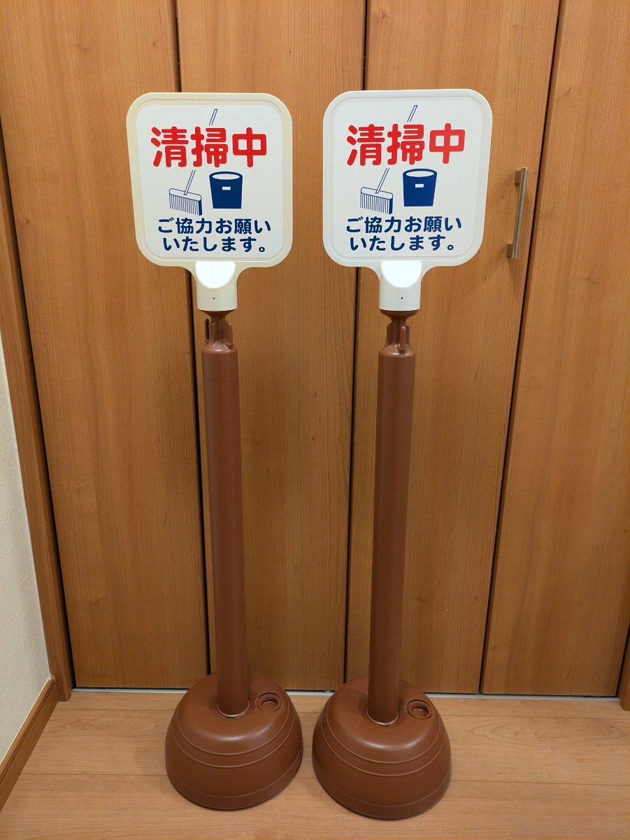 「清掃中」のチェーンポール両面看板2本セットです。重り部に水または砂を入れて使用して下さい。高さは看板上部まで約123cmです。未使用ですが保管に伴うキズ・色あせ等はご了承下さい。3Nでお願いします。