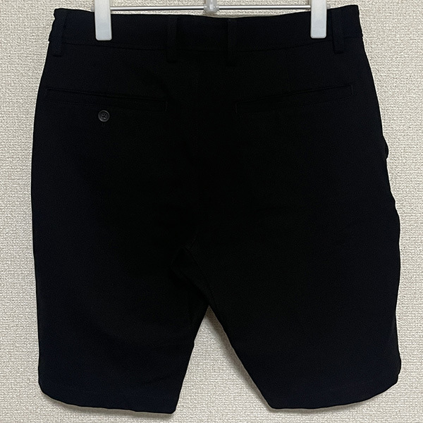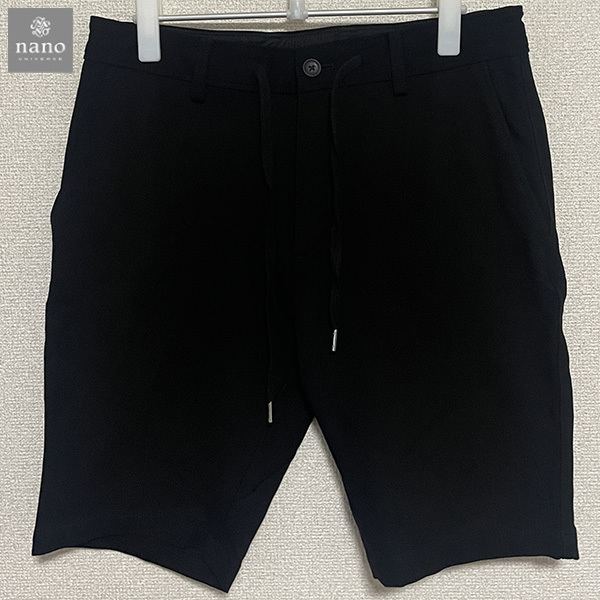 ナノユニバースのショートパンツです。カラーはブラックです。素材はレーヨン67% ナイロン29% ポリウレタン4%、表記サイズはL 実寸 ウエスト80cm 股上25cm 股下26cm 裾幅23cm(素人採寸ですのでご了承ください)。送料無料(メール便発送)にいたしますのでどうぞよろしくおねがいします。