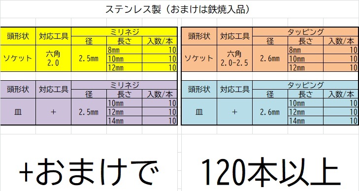 ご覧頂きありがとうございます。 【商品の説明】 自作PCやラジコン、海外製品などでよく使われるM2.5 ネジ各種ステンレス製 のご紹介になります。 ホームセンターなどにもなかなか売っていません。ネットショッピング等で 購入しても送料ばかりかかって購入するのがもったいないですよね... 更に小さいネジなのですぐにネジ山がつぶれてしまう経験御座いませんか? M2.5ソケットボルトは通常1.5mmのレンチを使用するのが一般的ですが 私の商品は2.0~2.5mmのレンチを使用するのでしっかりと締め付け、 ネジ山のつぶれ防止にも非常に効果的です。 サイズ M2.5 (ステンレスミリネジ) ソケットボルト 8mm 10mm 12mm 皿ボルト 10mm 12mm 14mm M2.6 (ステンレスタッピング) ソケットボルト 8mm 10mm 12mm 皿ボルト 10mm 12mm 14mm 上記は各種10本づつ (画像右のボルトはオマケです、出品時期により変化することがあります) 入札の方お待ちいたしております。 | ||||