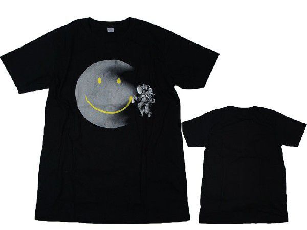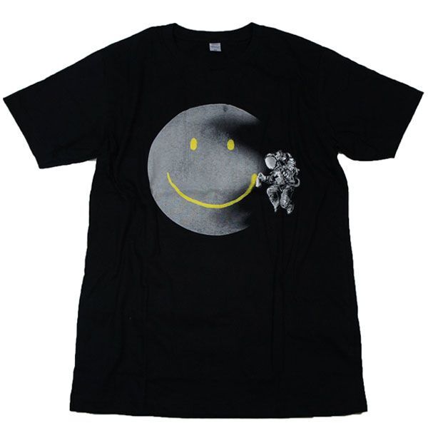 黒地に描かれた大きなスマイルと宇宙飛行士のイラストが、遊び心をくすぐります