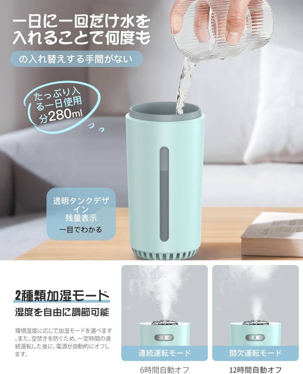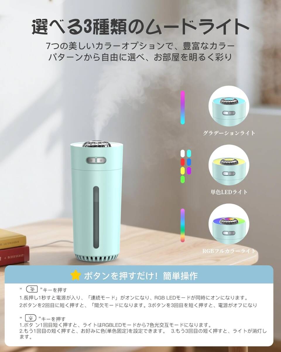 機能:ムードライト(RGB/単色/グラデーション)、自動停止、空焚き防止、アロマ&次亜塩素酸水対応
