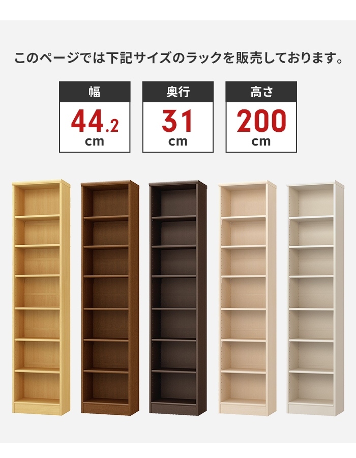 | ※【同シリーズ】のリンクは当店のヤフオク店のページへ進みます。 エースラック/カラーラック 【本体(奥行31cm※共通)】 ● 高さ60cm 幅28.6cm/幅44.2cm/幅59.2cm/幅86.5cm/幅116.5cm ● 高さ88.1cm 幅28.6cm/幅44.2cm/幅59.2cm/幅86.5cm ダイワ/幅116.5cm ダイワ ● 高さ117cm 幅28.6cm/幅44.2cm/幅59.2cm/幅86.5cm ● 高さ149.9cm 幅28.6cm/幅44.2cm/幅59.2cm/幅86.5cm ● 高さ178cm 幅28.6cm/幅44.2cm/幅59.2cm/幅70.2cm/タフ 幅70.2cm/幅86.5cm ● 高さ200cm 幅28.6cm/幅44.2cm/幅59.2cm/幅70.2cm/タフ 幅70.2cm/幅86.5cm 【追加棚(奥行27.8cm※共通)】 ● 厚さ1.7cm 幅24.9cm(本体幅28.6cm用)/幅40.5cm(本体幅44.2cm用)/幅55.5cm(本体幅59.2cm)/幅66.5cm(本体幅70.2cm) ● 厚さ2.5cm(タフ) 幅66.5cm(本体幅70.2cm) ※このページは[本体(高さ200cm/幅44.2cm)]を販売しております。 |