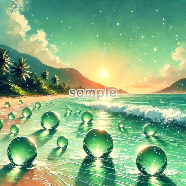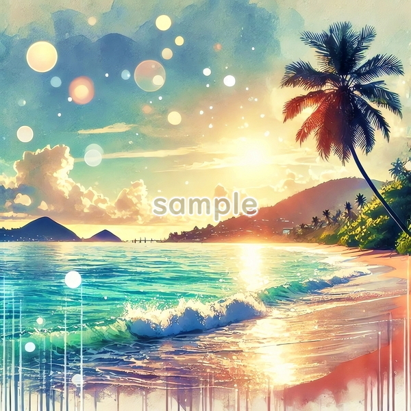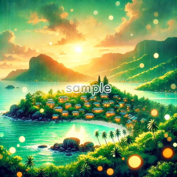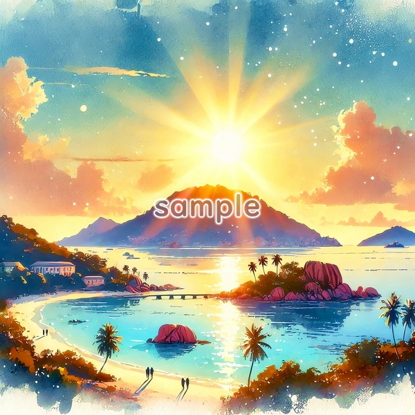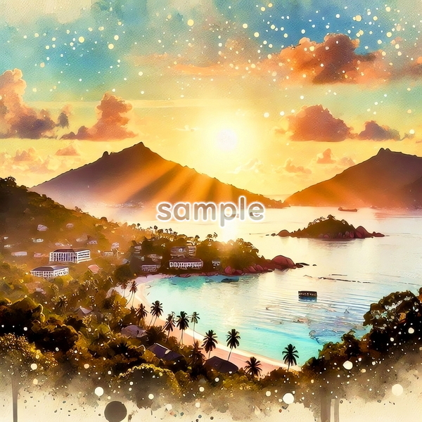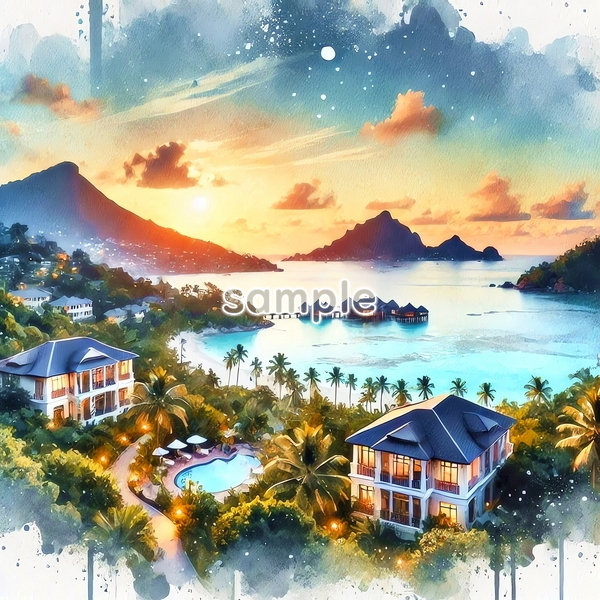 セーシェル 世界国景色 緑と夕日と光 水彩 オリジナル絵イラスト 174P Seychelles World country scenery green sunset light watercolor Original painting art picture image material