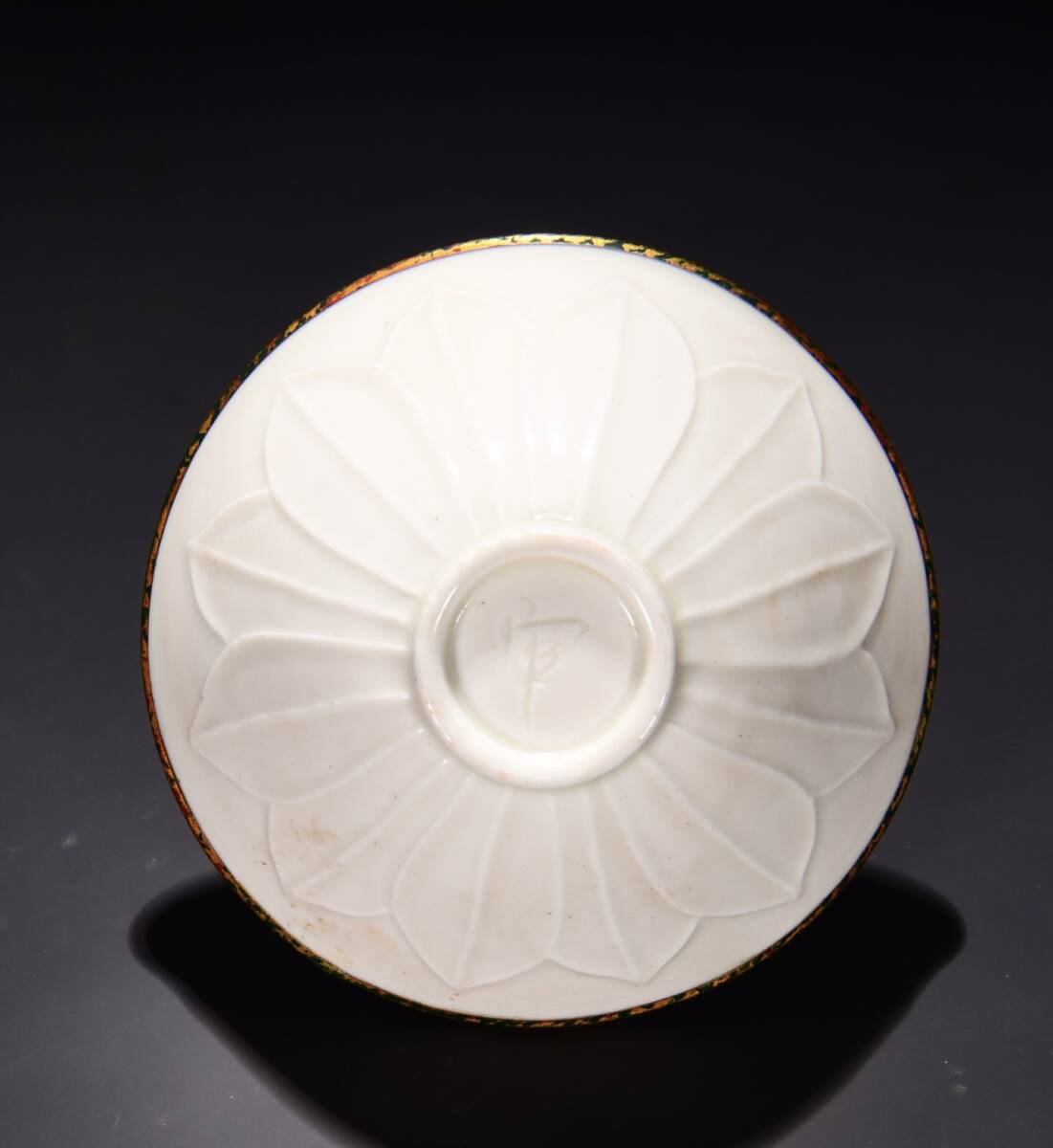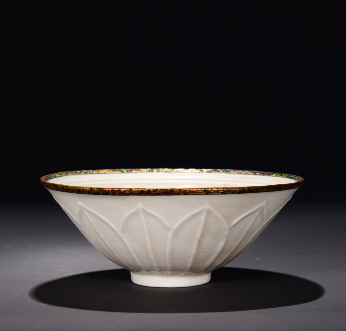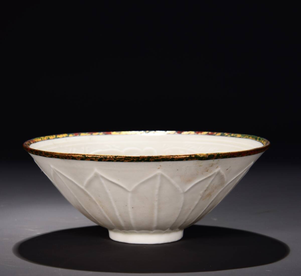 宋時代 古陶磁器 定窯 白釉 碗 蓮花魚藻紋 包金口 斗笠碗 磁器 文案置物 擺件 時代物 古董品 骨董 旧家蔵出し 唐物 中国古玩 古美術