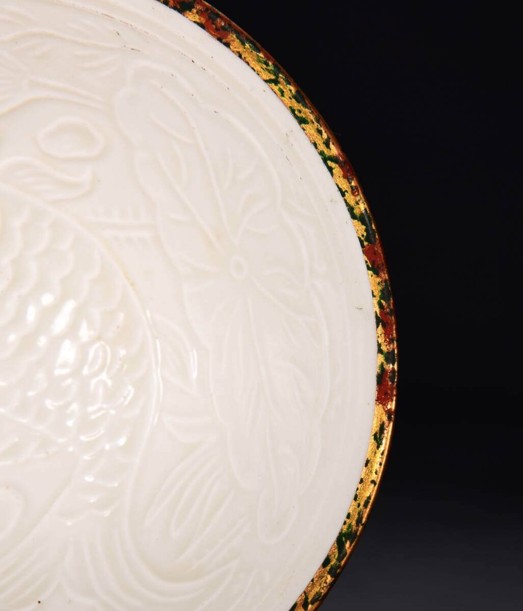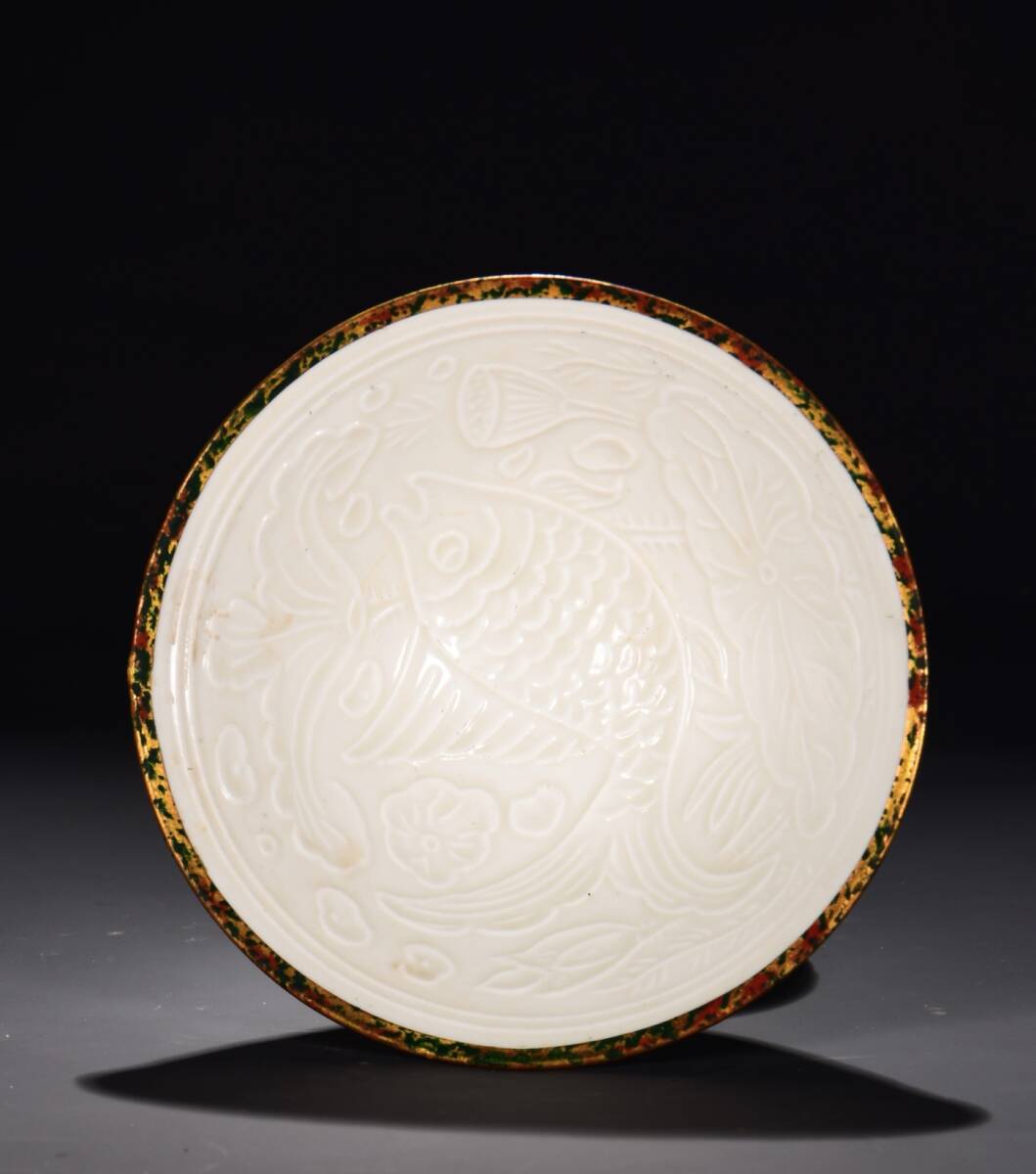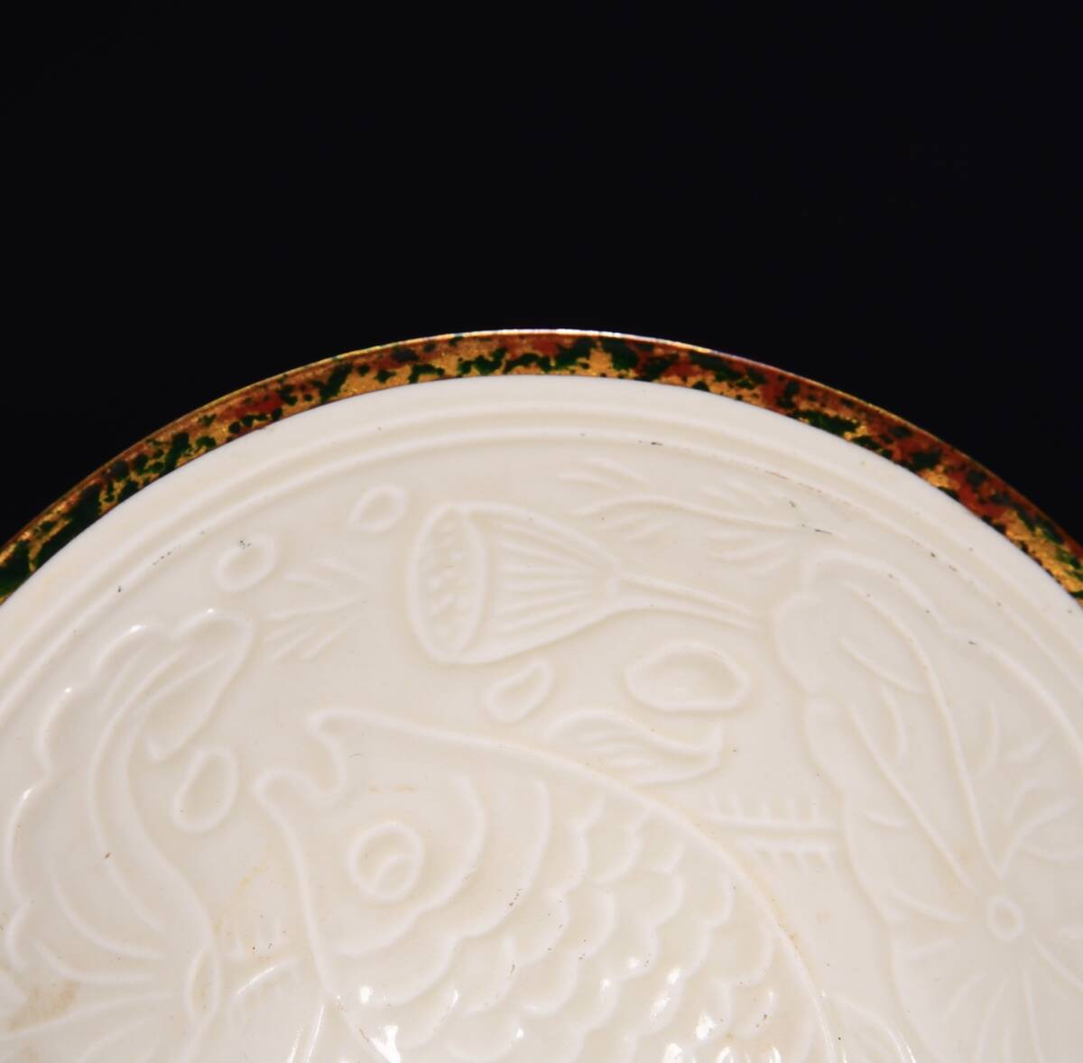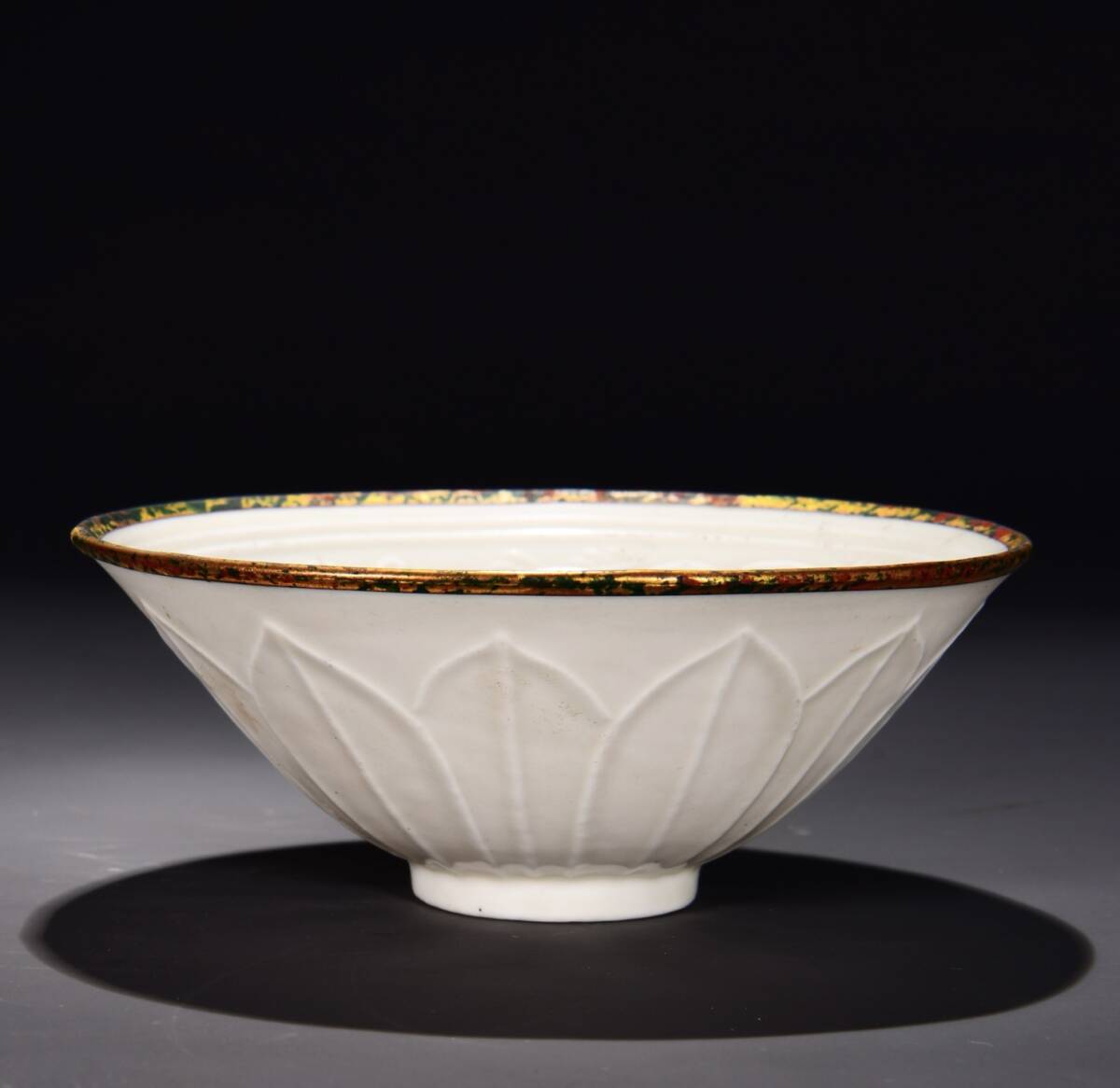 宋時代 古陶磁器 定窯 白釉 碗 蓮花魚藻紋 包金口 斗笠碗 磁器 文案置物 擺件 時代物 古董品 骨董 旧家蔵出し 唐物 中国古玩 古美術