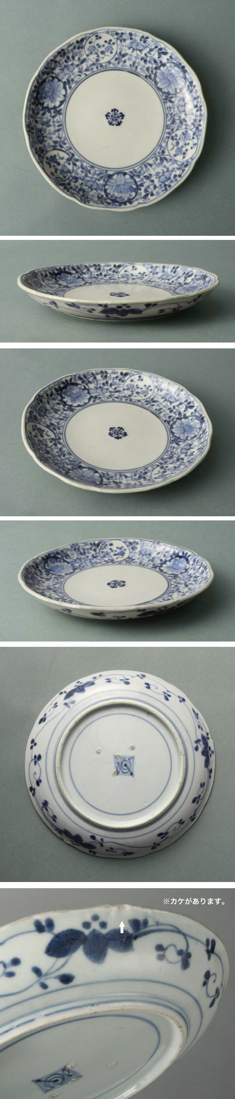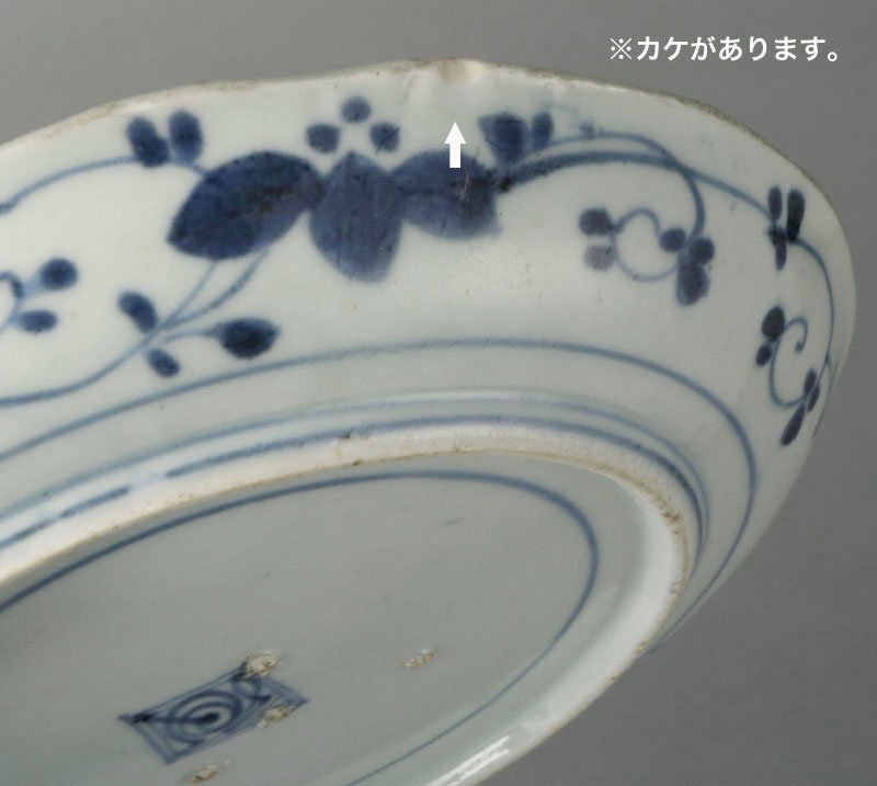 | 元禄様式の古伊万里染付皿です。 口縁は輪花状に成形され、口縁部を巡るように牡丹唐草文が絵付けされています。また、白抜き見込みの中央には五弁花の文様が添えられています。 高台内には圏線を引き渦福銘が描かれております。 輪花の滑らかな曲線と見込みに描かれた花唐草が優しい印象を与える逸品です。 寸法:高さ2.5cm、幅18cm(最大幅。若干の誤差はご了承下さい) 状態:経年感、カケがございます。 |