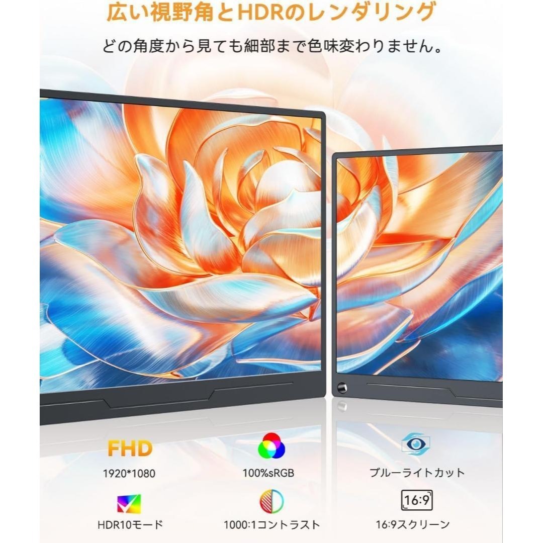 【プロ認証の色彩精度&非光沢IPS&100% sRGB広色域】UPERFECTモバイルモニターは医療監修ブルーライト軽減技術で目の疲労を37%低減※しながら、178°超広視野角IPSパネルが1670万色の真実の色を再現。 写真編集時はMacBookとの色差ゼロを実現し、Netflix鑑賞時はHDR擬似対応で暗部のディテールまでくっきり。低反射非光沢処理がオフィスの蛍光灯映り込みをシャットアウトするため、カフェの窓辺で作業しても画面が鮮明!(※自社テスト比較)