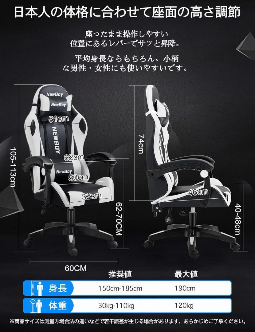 ゲーミングチェアのサイズ:幅62×奥行49×高さ105~113cm(座面高:40~48cm)。高さ調節が可能で、小柄な女性でも快適に座れるモデルです。