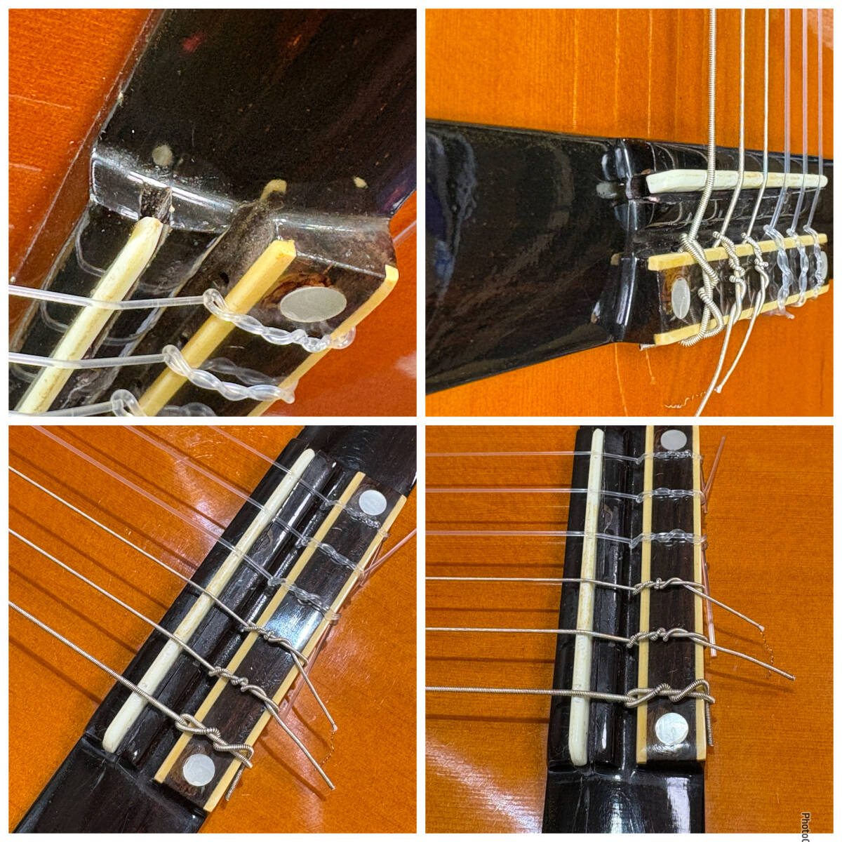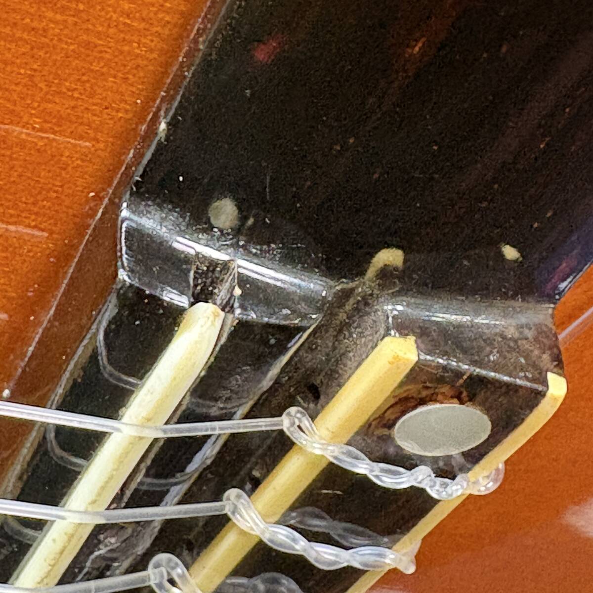 ブリッジのサドルの溝が広げられいたため応急で木材でシムを作り挟んでいます。
