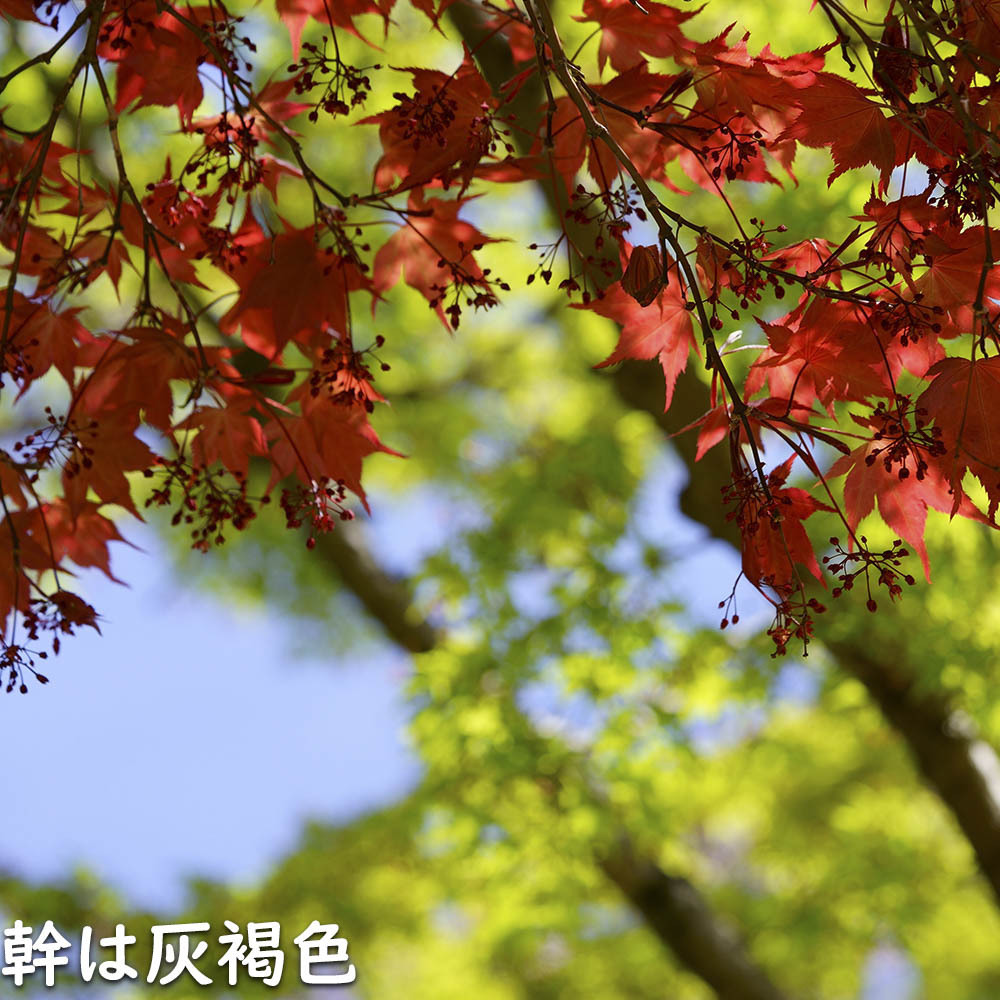 ノムラモミジは赤葉品種です。葉が新しく出たときから赤く色づいています。夏場は緑になりますが、紅葉シーズンになると再度赤になります。数あるモミジの品種の中でも人気がある品種です。