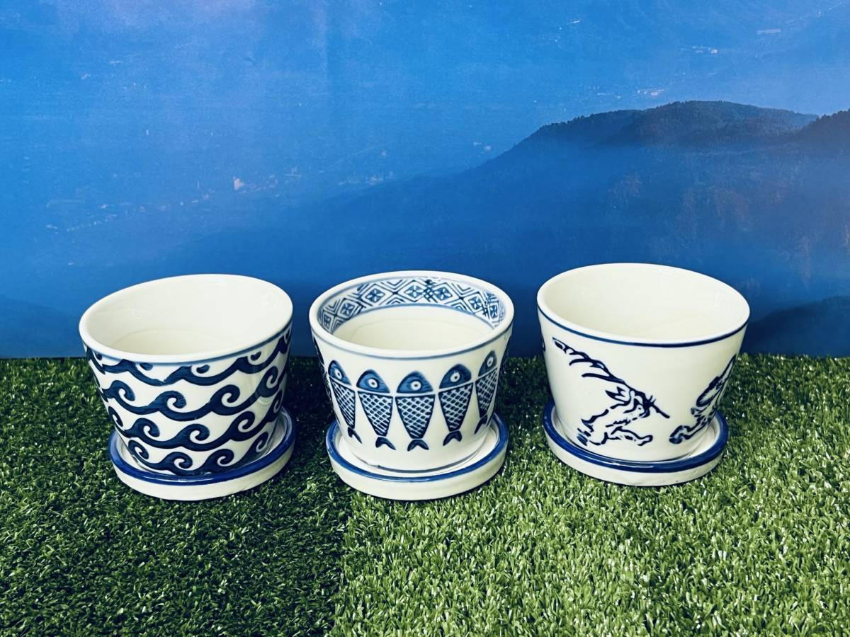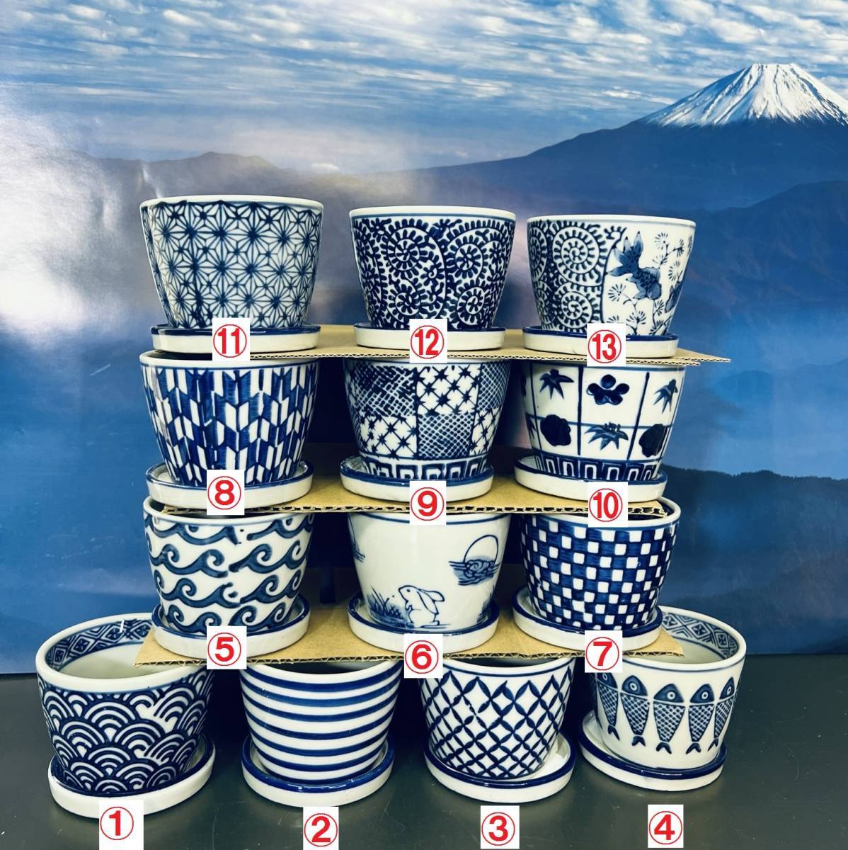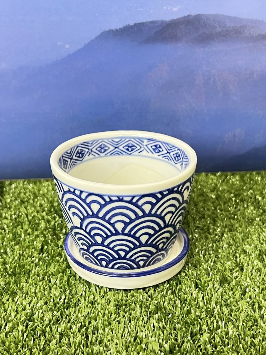 陶器 【そば猪口型 皿付き植木鉢 柄ランダム三点セット】染付 盆栽 植物 多肉 庭園 お庭 人気