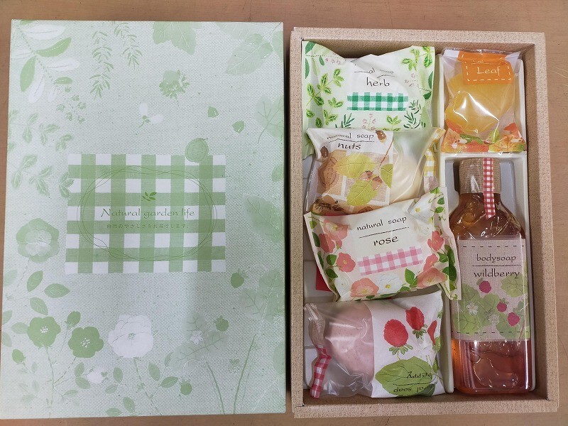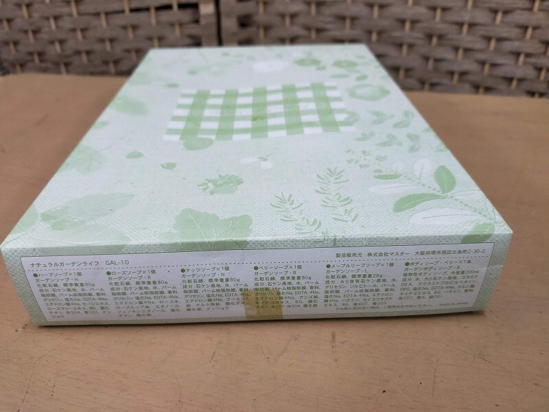 ナチュラルで優しい香りを楽しめる「ナチュラルガーデンライフ GAL-10」ギフトセットです。 ハーブ、ローズ、ナッツ、ベリー、メープルリーフの5種類のガーデンソープと、ワイルドベリーの香りのボディソープが入っています。 新品・未使用のため、プレゼントやご自宅用に最適です。 外箱に保管時の細かいスレがありますが、内容物はきれいな状態です。 【セット内容】 ハーブソープ 80g ×1 ローズソープ 80g ×1 ナッツソープ 80g ×1 ベリーソープ 80g ×1 メープルリーフソープ 28g ×1 ボディソープ(ワイルドベリー)200ml ×1 【状態】 新品・未使用(外箱に軽いスレあり)