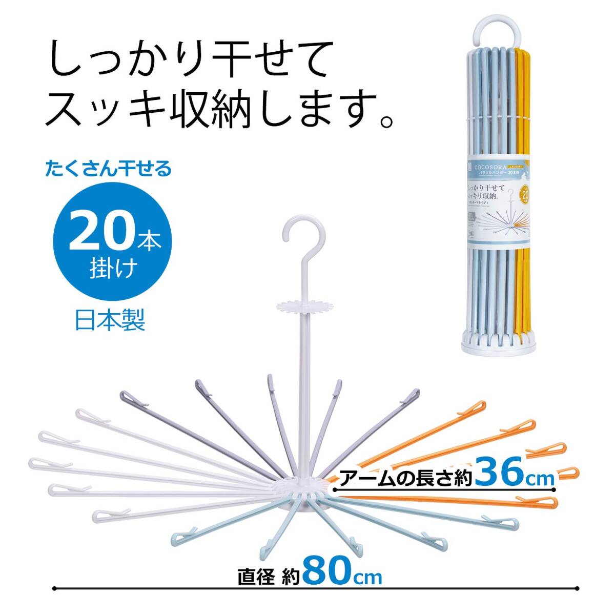 説明 しっかり干せてスッキリ収納します。 20本掛のスタンダードタイプ。 洗濯物が落ちにくいクリップ付です。 直径:約80cm、アームの長さ:約36cm。 収納に便利なミニフック付き。 [サイズ](閉じた時)約幅10×奥行10×高さ43.5cm、 (広げた時)直径約80cm、 (アームの長さ)約36cm [重量]約449g [素材・材質]本体・アーム:ポリプロピレン/ アームの留め部:ポリエチレン [生産国]日本